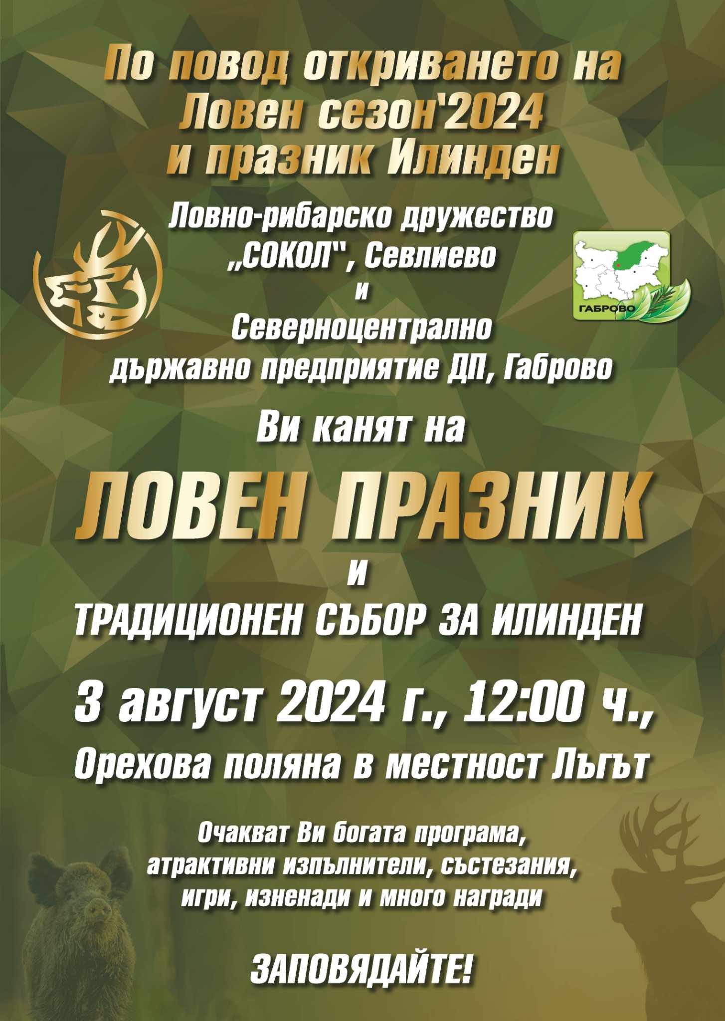 Традиционният празник на ловно-рибарско дружество „Сокол“ по повод откриването на ловен сезон ‘2024 и традиционния събор за Илинден ще се проведе тази събота, 3 август, на Ореховата поляна в местността Лъгът. С него ще се отбележи 127-ата годишнина от създаването на дружеството и ще се даде старт на новия ловен сезон.