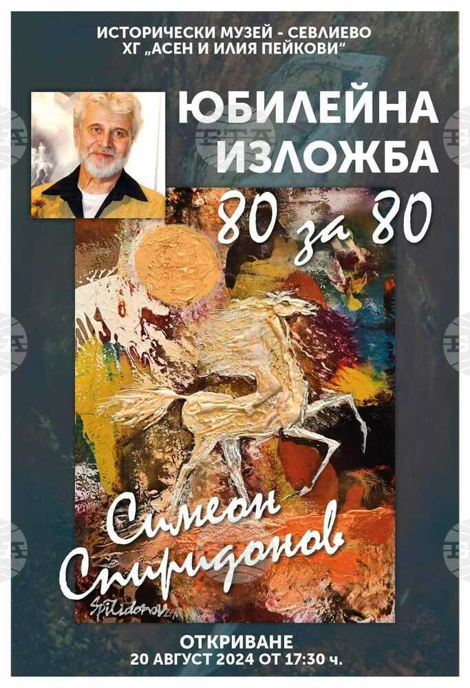 В Художествена галерия „Асен и Илия Пейкови“ на 20 август ще бъде представена юбилейната изложба „80 за 80“ на Симеон Спиридонов. Това съобщават организаторите.