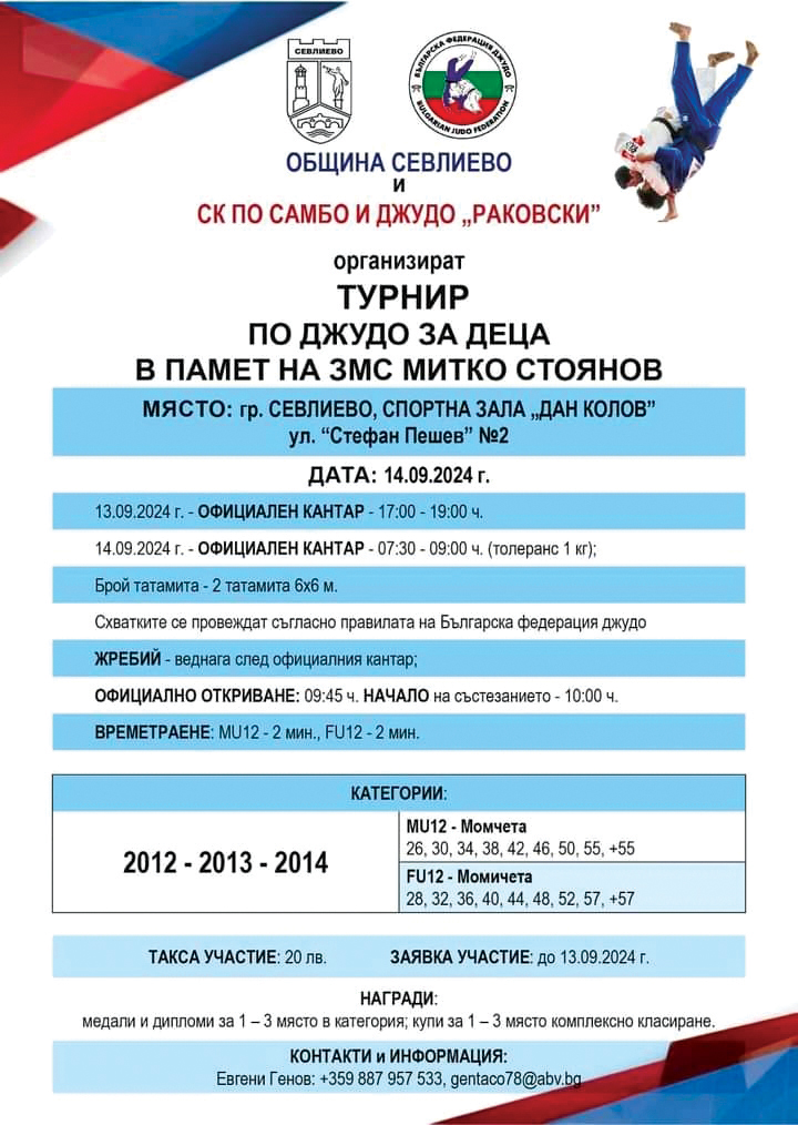 Турнир по джудо за деца, в памет на заслужилия майстор на спорта /змс/ Митко Стоянов ще се проведе в Севлиево. Надпреварата, организирана от местния клуб по самбо и джудо „Раковски“ и със съдействието на Община Севлиево, ще се състои на 14 септември, в зала „Дан Колов“.