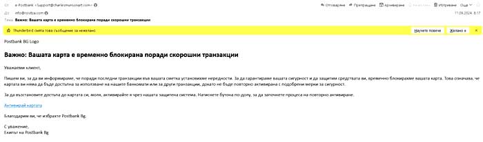 Пишем ви, за да ви информираме, че поради последни транзакции във вашата сметка установихме нередности. За да гарантираме вашата сигурност и да защитим средствата ви, временно блокирахме вашата карта. Това означава, че картата ви няма да бъде достъпна за използване на нашите банкомати или за други транзакции, докато не бъде повторно активирана с подобрени мерки за сигурност.