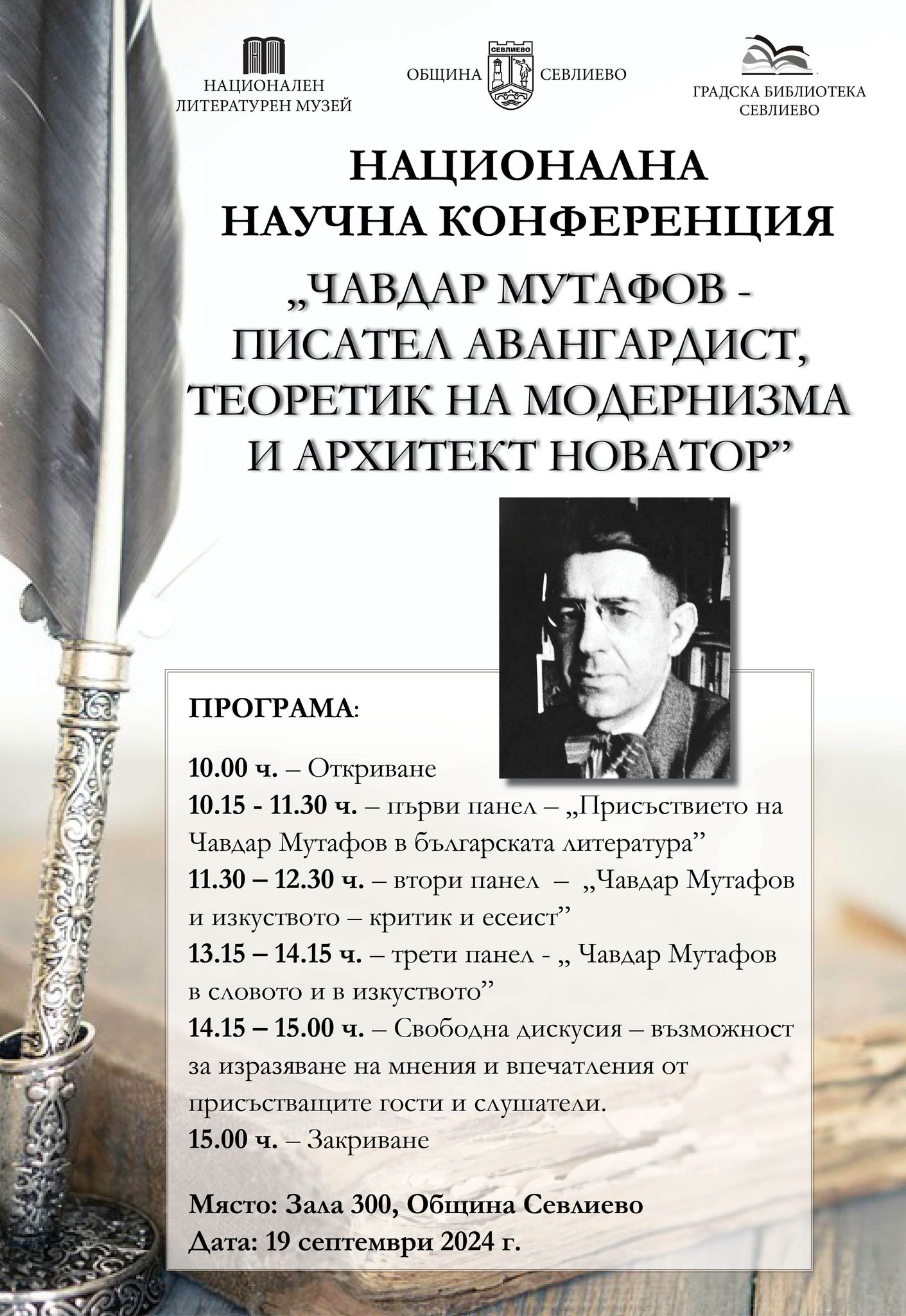 А за да поставят в дневния ред на града името и паметта на Чавдар Мутафов и рода Мутафови, Община Севлиево, Национален литературен музей и Градска библиотека – Севлиево организират и Национална научна конференция „Чавдар Мутафов – писател авангардист, теоретик на модернизма и архитект новатор”. Конференцията ще се проведе на 19 септември (четвъртък), от 10:00 часа в зала 300 на Община Севлиево. Модератор и водещ на форума ще бъде Катя Зографова – литературен историк, литературовед, документалист, есеист и писател, главен уредник на къща музей „Н. Й. Вапцаров” – НЛМ.