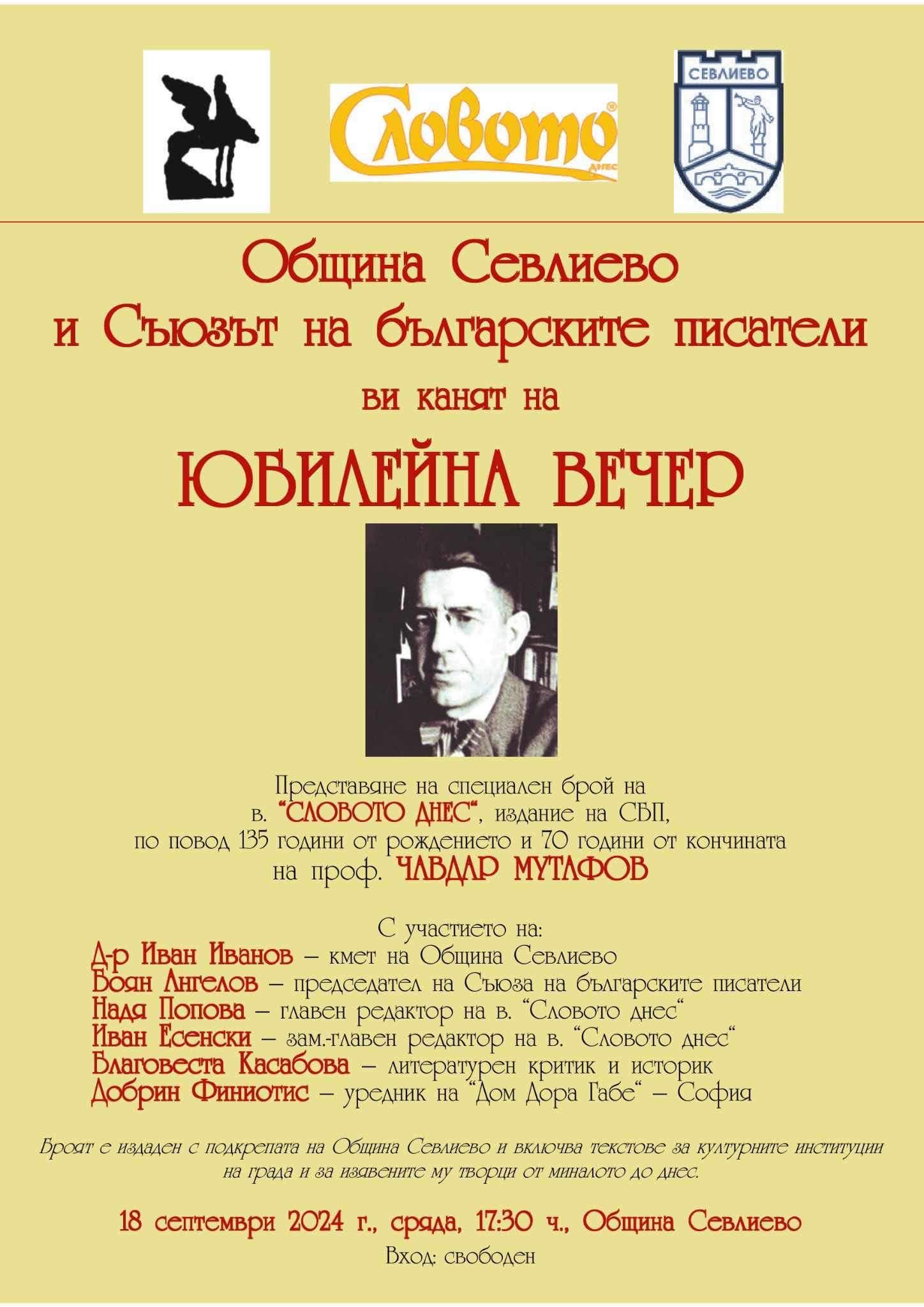 Община Севлиево и Съюзът на българските писатели организират юбилейна вечер, на която ще бъде представен специален брой на вестник “Словото днес“, издание на (СБП), по повод 135 години от рождението и 70 години от кончината на проф. Чавдар Мутафов.