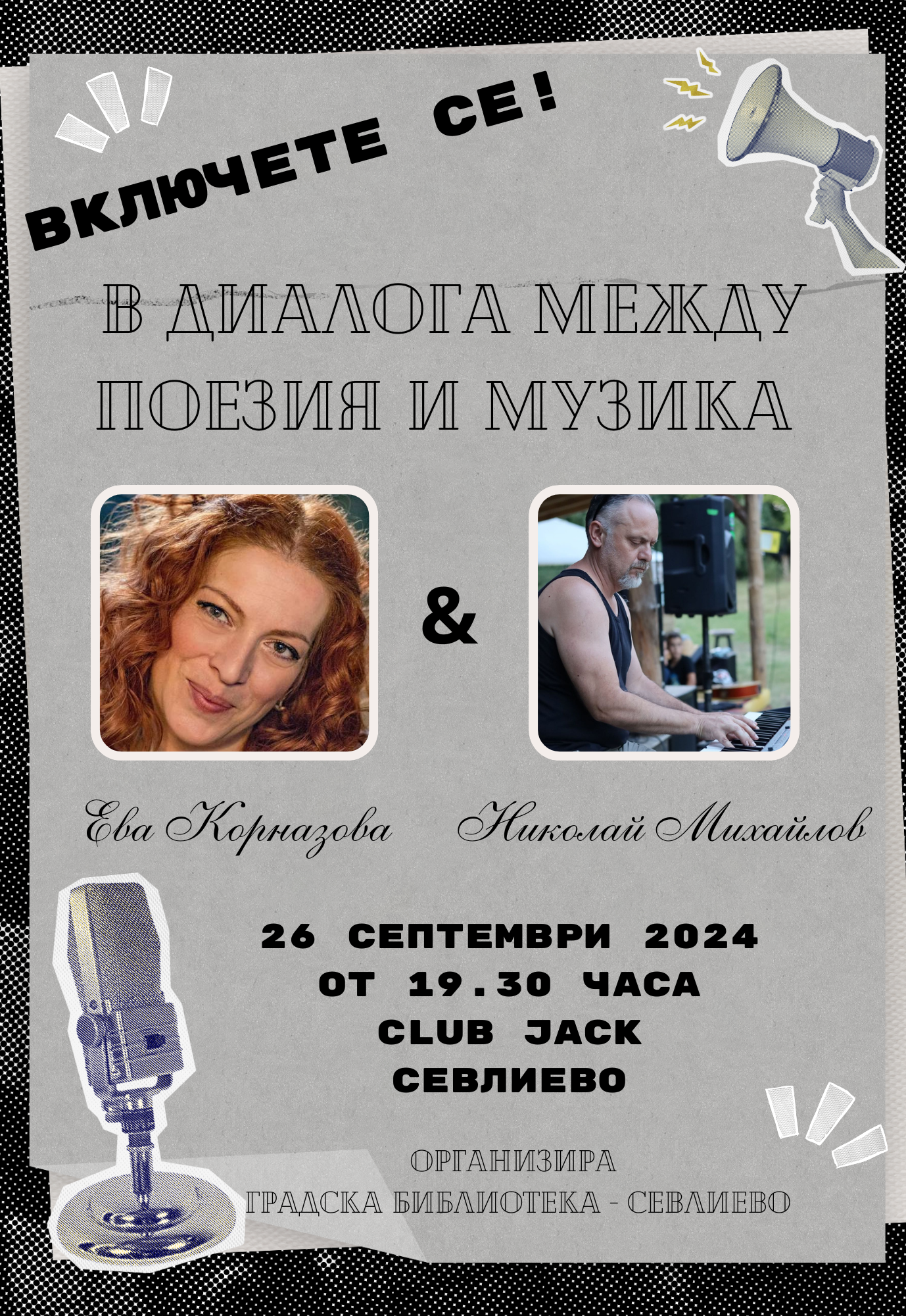 Диалог между поезията на Ева Корназова и музиката Николай Михайлов организира Градската библиотека в Севлиево. Тя е втората от поредицата „сТИХове на ГЛАС”.