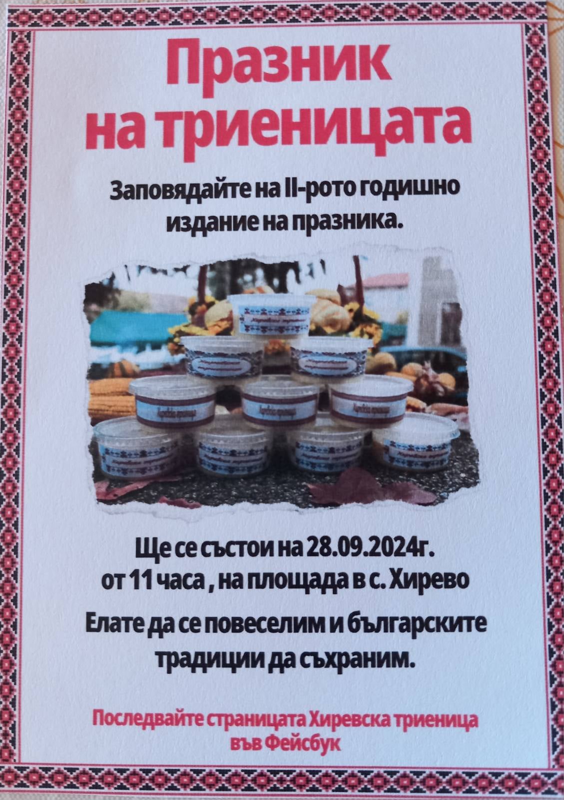 Утре – 28 септември, в село Хирево ще се проведе втория Празник на триеницата. След успешното му първо издание, организаторите на празника очакват тази събота, от 11:00 часа, още повече гости от близо и далече.