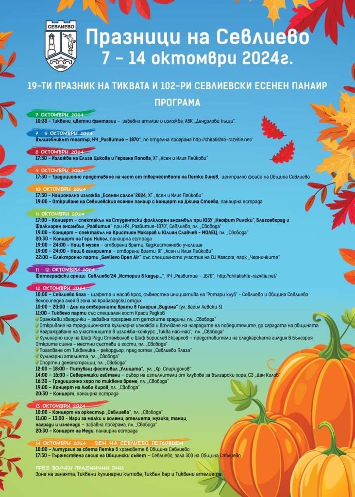 На Петковден – 14 октомври, Севлиево ще отбележи Деня на града, а по традиция в седмицата преди събитието се откриват 102-о издание на Севлиевския есенен панаир и тиквената фиеста. Празненствата започват на 7 октомври.