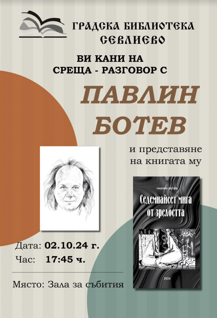 На 2 октомври, от 17:30 часа, в Градска библиотека – Севлиево ще се състои творческа среща с поета от Дряново Павлин Ботев. Той е роден през 1967 г. Автор е на 13 поетични книги с авангардна и акростихова поезия. В тандем със силистренеца Пламен Петров сътворяват и издават култовата „Поема за Бирняка“ (2002), „Нов юнашки епос” (2016) и допълнената версия „Поема за Бирняка +” (2018).