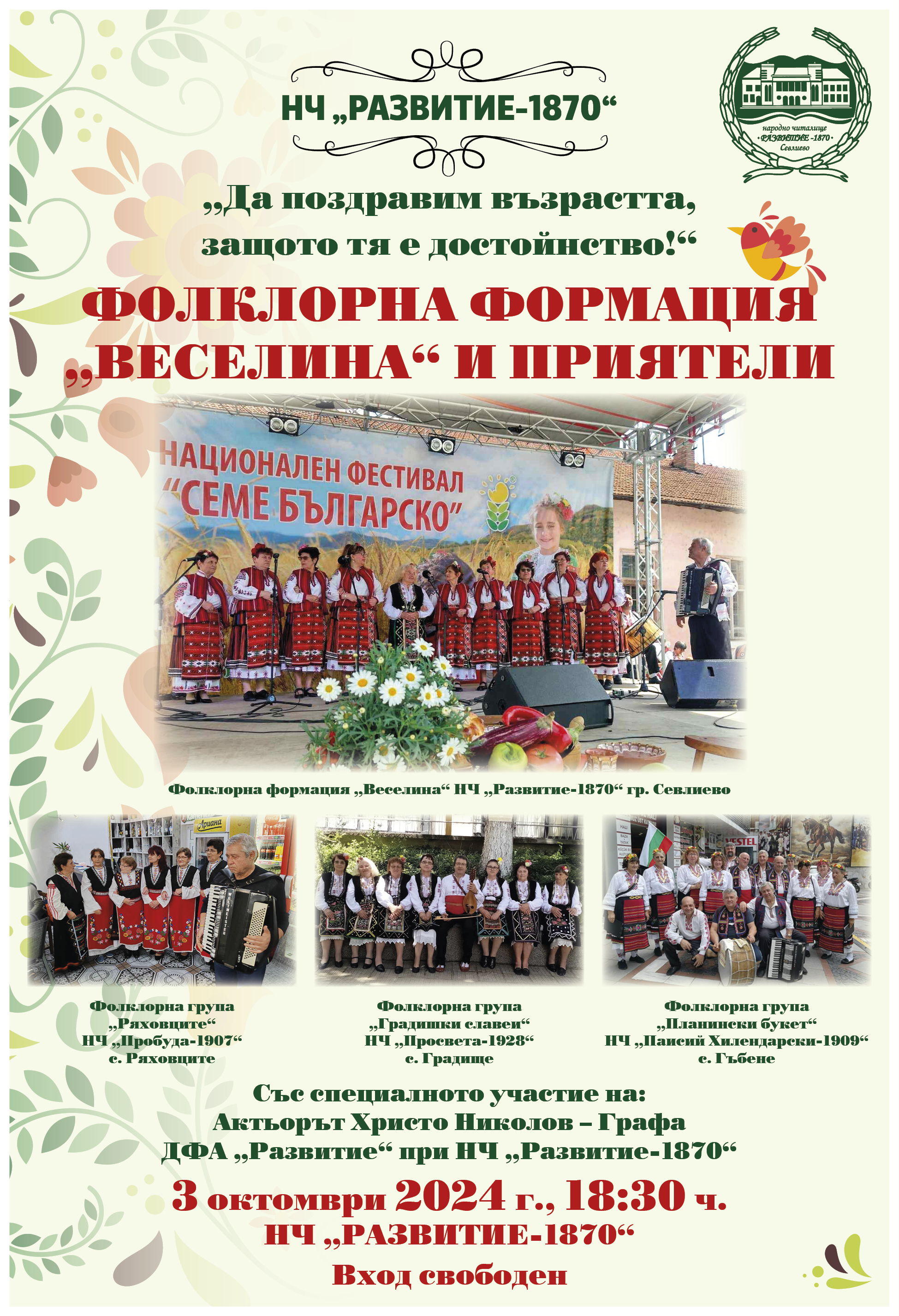 Фолклорна формация „Веселина” при Народно читалище „Развитие-1870” и приятели канят на концерт. Събитието е посветено на възрастните хора и ще се състои на 3 октомври, от 18:30 ч., в салона на НЧ „Развитие-1870”. Мотото е: „Да поздравим възрастта, защото тя е достойнство!”.