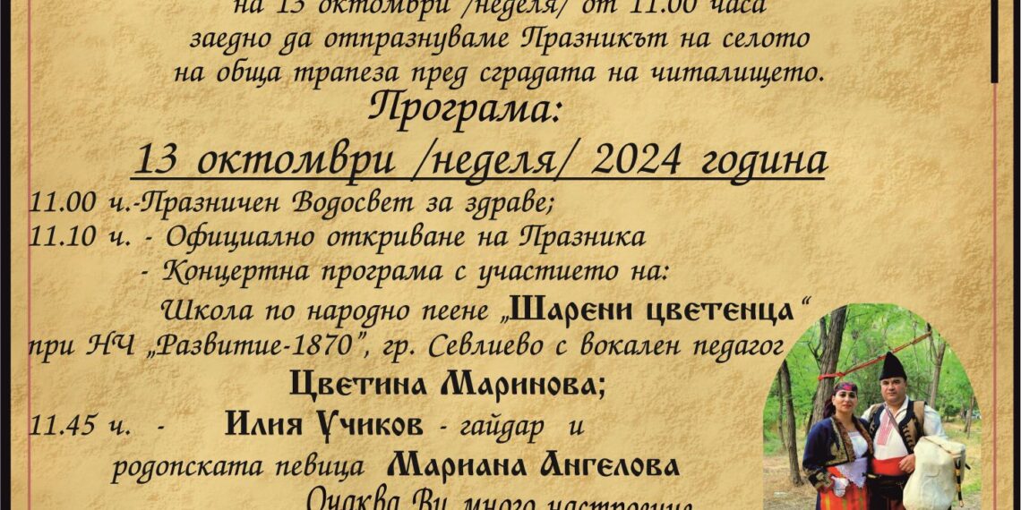 Начало ще сложат певците от вокална група “Шарени цветенца”, с ръководител Цветина Маринова при НЧ ”Развитие-1870″. За доброто настроение на гостите ще се грижат известният гайдар Илия Учиков и родопската певица Марияна Ангелова.