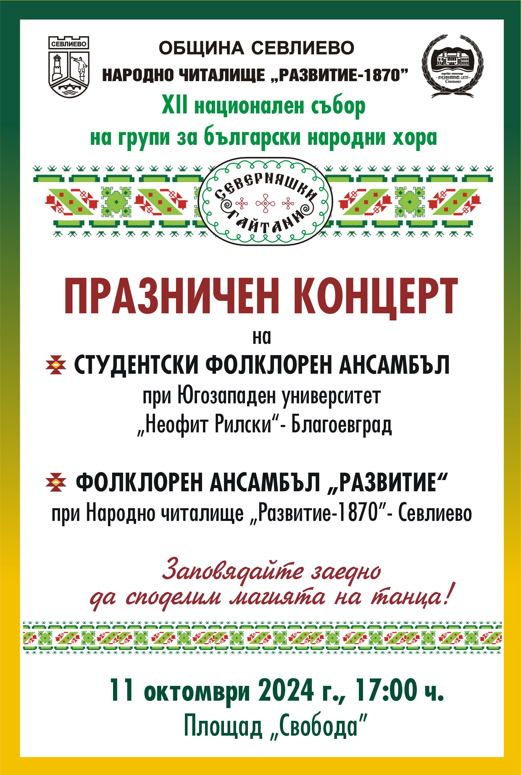 Празничен концерт на Студентски ансамбъл при Югозападен университет „Неофит Рилски” – Благоевград и Фолклорен ансамбъл „Развитие” при НЧ „Развитие-1870” е част от дванадесетото издание на националния събор на групи за народни хора „Северняшки гайтани”. Събитието е на 11 октомври 2024 г., от 17:00 ч., на площад „Свобода”. Концертът е част от богата програма за празниците на града и се организира със съдействието на Община Севлиево.