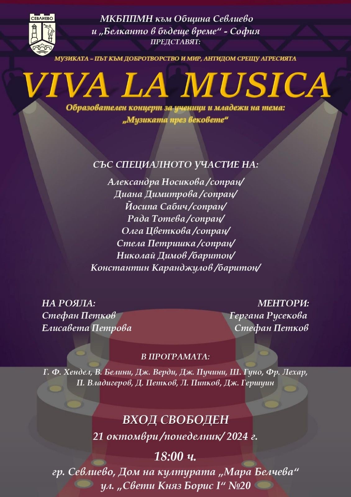 Местната комисия за борба срещу противообществените прояви на малолетните и непълнолетните (МКБППМН) към Община Севлиево и „Белканто в бъдеще време“ София организират: образователен концерт „VIVA LA MUSICA“ на тема „Музиката през вековете“. Неговата цел е да се популяризира изкуството в България; да се подкрепя развитието на младите творци; да се въвлекат младежите в света на изкуството, за да се убедят сами в слогана: „Музиката – път към добротворство и мир, антидот срещу агресията“, „Прекрасно е да си културен!“.
