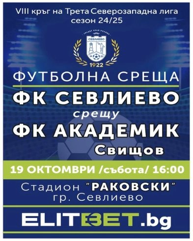 Футболно дерби на Северозапада се задава тази събота. На свой терен мъжкият отбор на ФК „Севлиево“ ще приеме „Академик“-Свищов. Срещата е от 16 ч, на стадион „Раковски“ и е от 8 кръг на ELITBET Трета Северозападна лига.