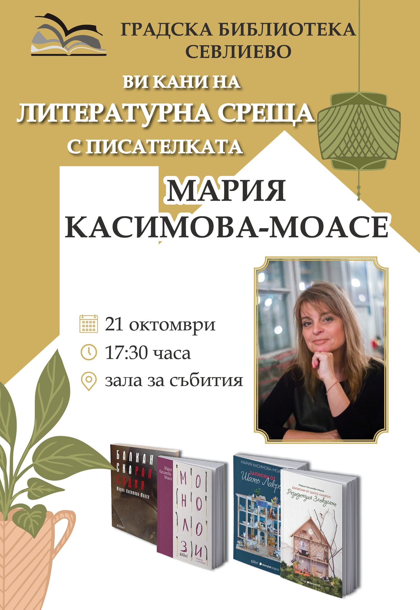Поредната вълнуваща среща ще предложи Градска библиотека – Севлиево на четящите хора от града на 21 октомври, от 17:30 часа. Този път специален гост ще бъде Мария Касимова-Моасе – журналист, публицист, писател.