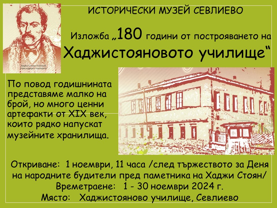 “180 години от построяването на Хаджистояновото училище” е името на изложбата на Исторически музей Севлиево, която ще бъде отворена за посетители на 1 ноември, петък, веднага след тържеството за Деня на народните будители.