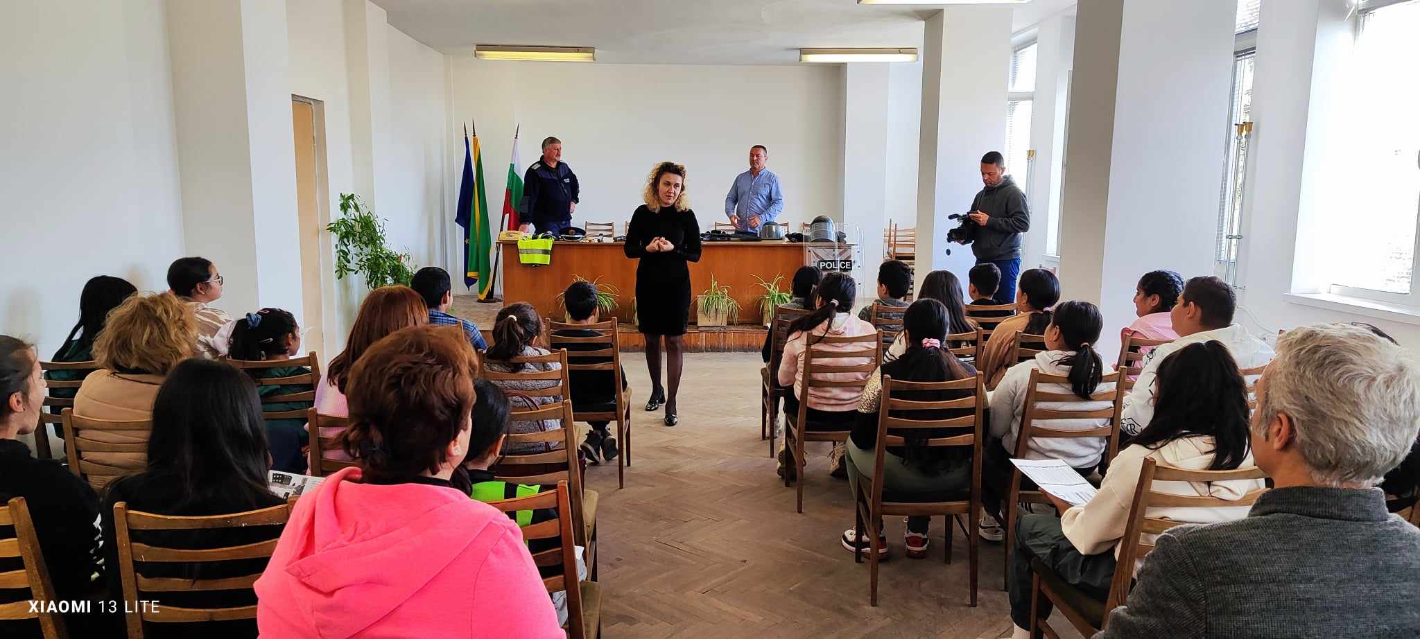 След встъпителните думи полицейските инспектори Иван Ботев от „Териториална полиция“ и Тихомир Елков от научно-криминалистичната лаборатория, които разказаха повече за естеството на ежедневната си работа. Те обясниха на децата как да разпознаят полицая, каква е униформата му, какви са отличителните знаци – шапка, светлоотразителна жилетка, както и ако полицейският служител не е униформен. На учениците им бяха показани част от помощните средства, които използват полицаите в ежедневната си работа – белезници, палка, каска, защитен шлем, щит, бронежилетка, радиостанция.