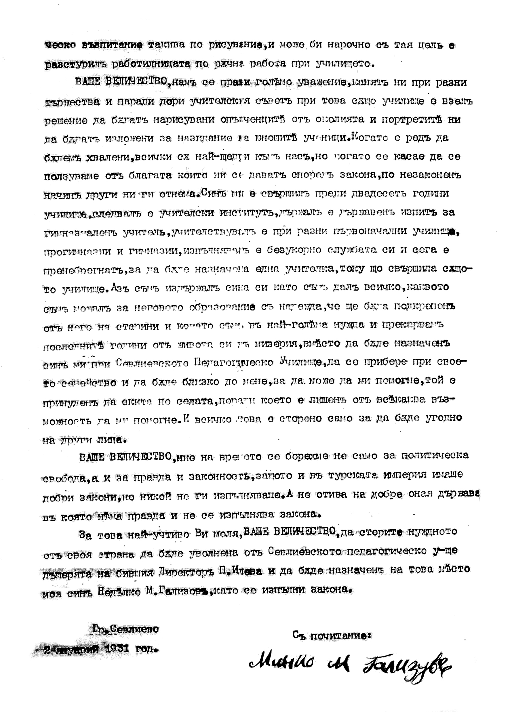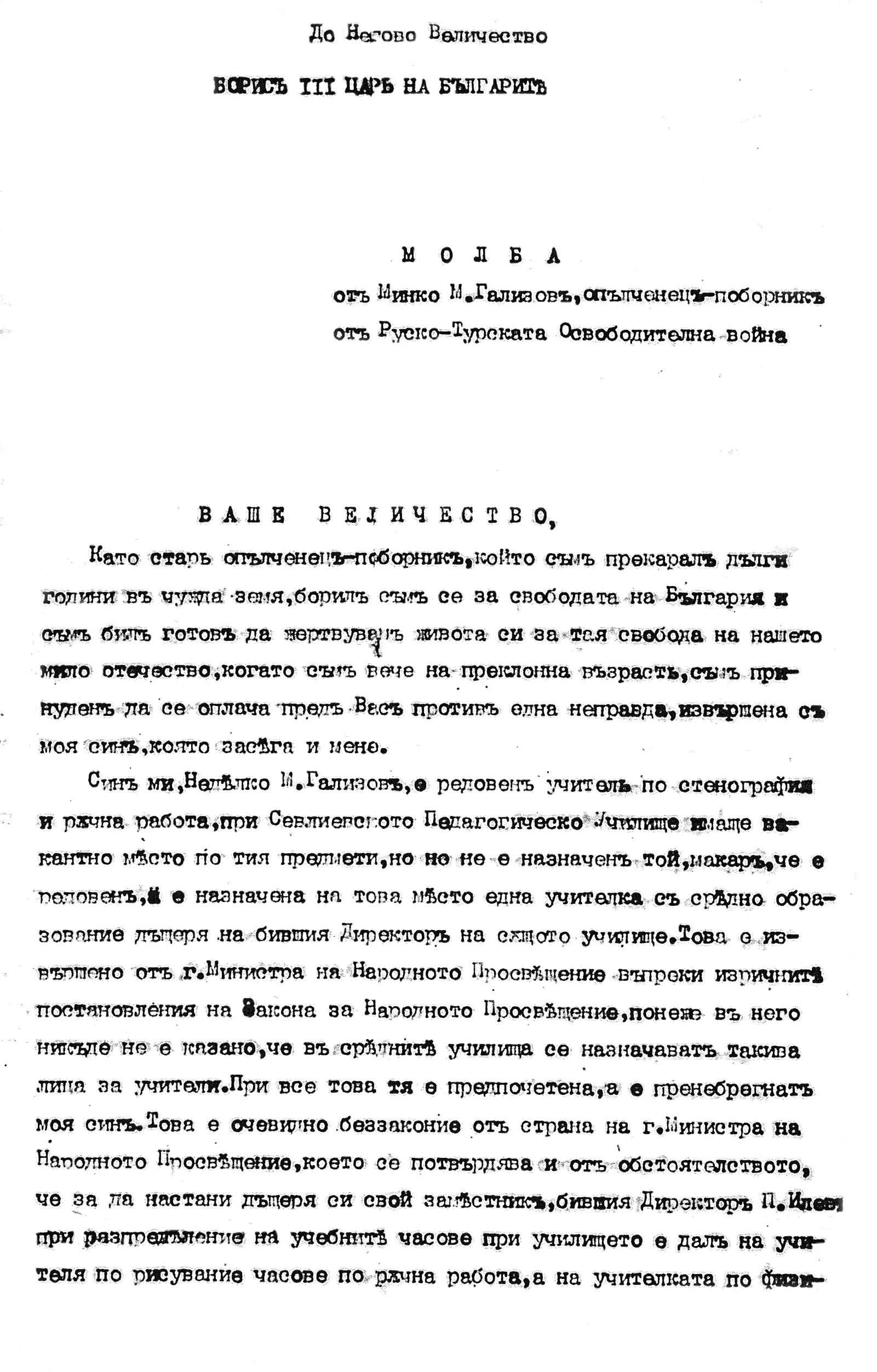 Както открихме съвсем наскоро, от документ, съхранен в ДА „Архиви“ гр. Габрово), през 1931 година опълченецът от с. Ловнидол Минко Гализов пише писмо до Негово величество Борис III Цар на българите. Става въпрос за несправедливо назначение на гимназиален учител в град Севлиево. На мястото по изисквания би трябвало да бъде назначен неговия син Недялко Минков Гализов, изпълняващ всички изисквания на закона, а е назначена учителка със средно образование, но дъщеря на бившия директор на гимназията.