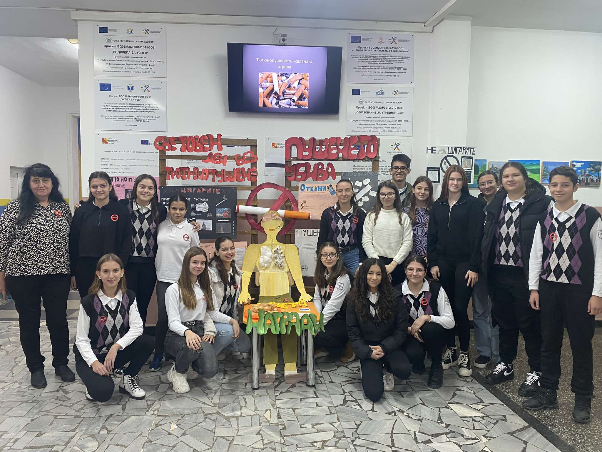 Членовете на клуба представиха пред по-малките си съученици информация за вредите от никотина и болестите, които причиняват тютюневите изделия. В този ден две от момичетата проявиха инициатива да раздадат на учителите, охраната на училището и връстниците си от клуба ръчно изработени от тях значки под наслов “Без тютюнопушене”.