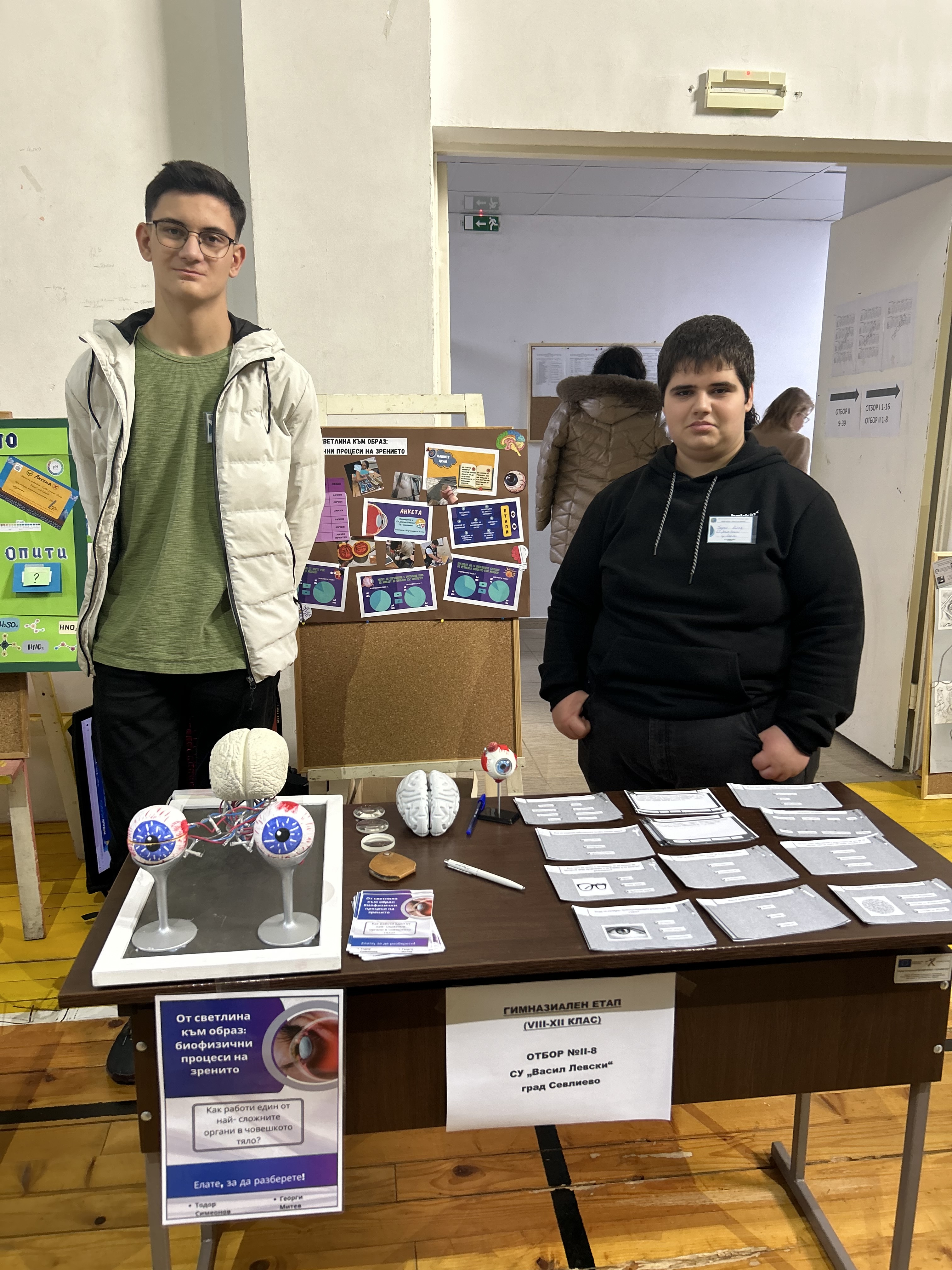 Първият проект от втора възрастова група „От светлина към образ: биофизични процеси на зрението“ на Георги Митев и Тодор Симеонов -10б клас с ръководител г-жа Ива Пейкова- учител по физика и астрономия, се нареди на 10-то място с оценка Отличен 5,50 /48,4 точки/ . Проектът им цели да обясни на учениците как работят едни от най-сложните органи в човешкото тяло – очите и мозъкът. Чрез макет на органите и зрителният нерв, който предава електрични импулси към мозъка, участниците обясниха как светлината се преработва в окото, преминава през зрителните нерви и образът се образува в мозъка. Вторият проект „Бързата мода в гардероба ни… и не само“ на Айда Гонги и Марилена Христова -10б клас с ръководител г-жа Мария Стойнова – старши учител по химия, зае 12-то място с оценка Отличен 5,50 /47,7 точки/. Целта на проекта е да засили интереса на младите хора към проблемите на „бързата мода“ и влиянието на модната индустрия върху климата и околната среда. Третият проект от втора възрастова група „Невидимото зло“ на Нели Лалева и Наталия Христова- 10б клас с ръководител г-жа Йонита Косева- учител по биология и здравно образование се нареди на 14-то място с оценка Отличен 5,50 /47,1 точки/. Темата на проекта бе киселинният дъжд. В него бе представено образуването на киселинния дъжд, последиците от него и как той може да се предотврати. Чрез опити за изследване на различни почви и измерване на тяхното pH се доказа влиянието на киселинността върху околната среда.