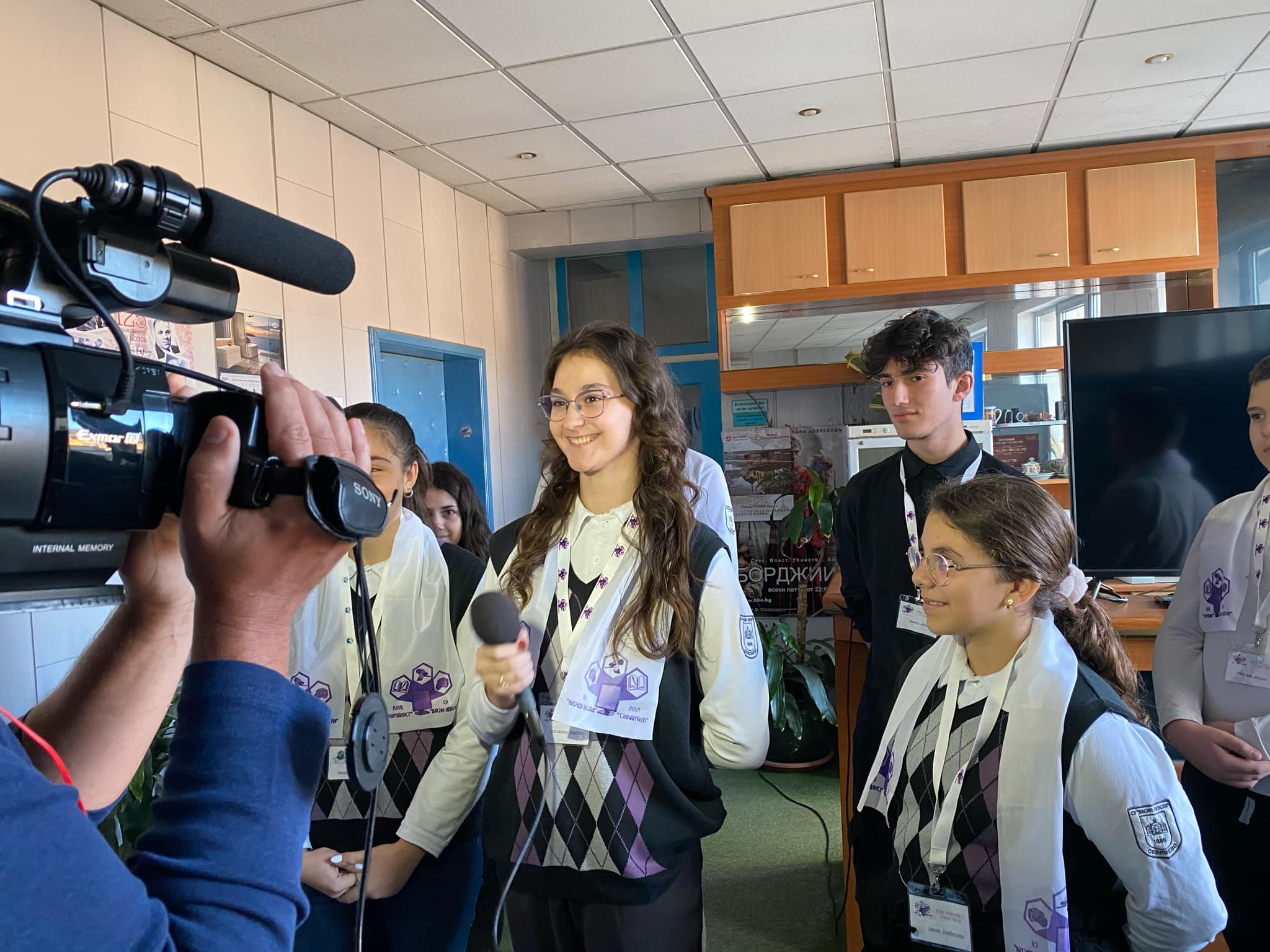 Накрая на посещението операторът засне кратко интервю, в което Марилена Христова от 10б клас в ролята на водещ зададе няколко въпроса на Александра Сашева от 8б клас за това какво й дава клуб „Журналист“ и дали смята да превърне писането в своя професия. Александра сподели и своите впечатления от телевизията, която, въпреки че не е голяма като националните, работи професионално. Каза, че е много интересно да се види какво става “зад кулисите”. После младите журналисти останаха да наблюдават работата на оператора върху заснетия материал.