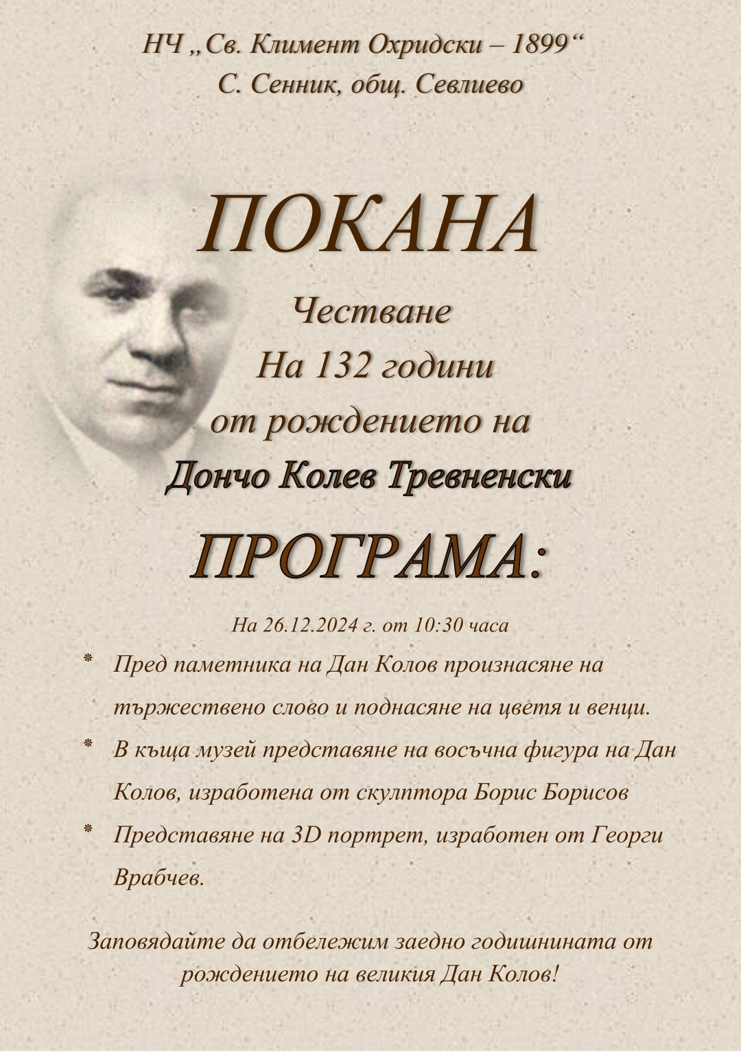На 26 декември т.г. в с. Сенник ще се чества 132-та годишнина от рождението на Величето в българската борба – на борецът-кечист Дончо Колев Тревненски – Дан Колов.