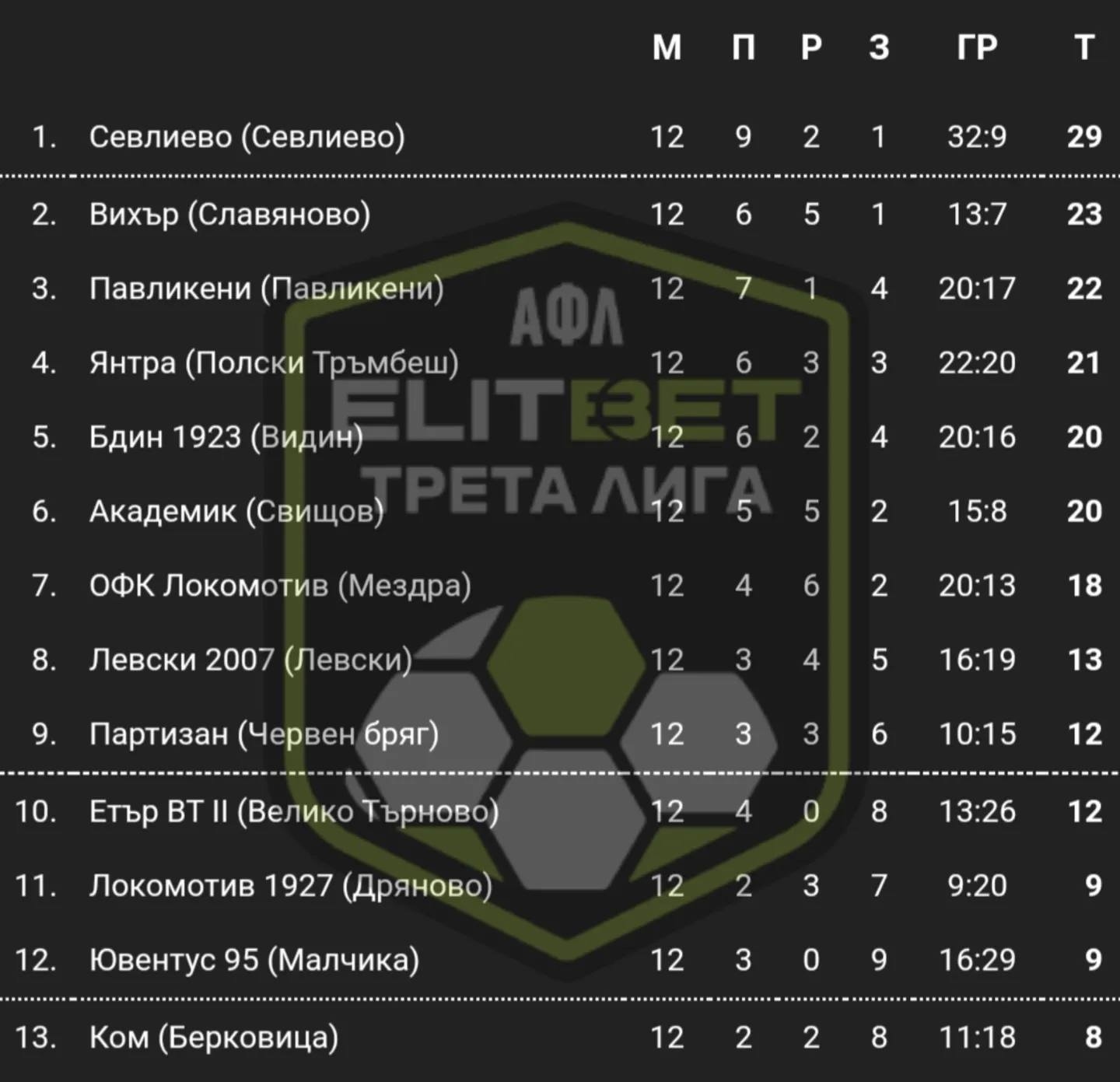 С шест точки преднина пред втория в подреждането на Северозападната Трета лига ще зимува представителният отбор на ФК „Севлиево“. След севлиевския тим е „Вихър“-Славяново. От изиграните 12 мача през есента съставът на Сашо Ангелов записа девет победи, две равенства и само една загуба, както и голова разлика – 32:9 (+23 гола).