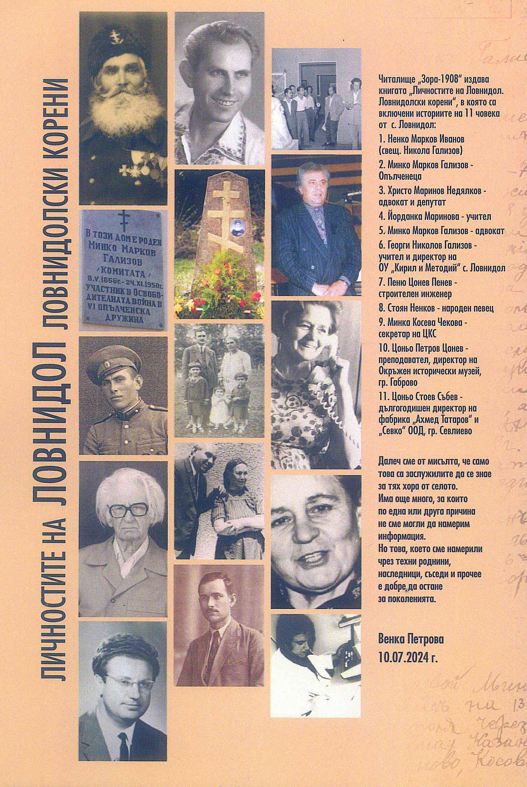 „Личностите на Ловнидол. Ловнидолски корени“ е заглавието на най-новата книга, издадена от НЧ „Зора-1908“. В нея са поместени историите за живота и делото на 11 души, родом от Ловнидол. Екипът на читалището и в частност – председателката на Читалищното настоятелство Венка Петрова, от години работи по издирване на материали, свързани както с историята на селото, така и с неговите успели и заслужили хора. Този неуморен труд се отблагодарява и така се събира доста информация, която днес е обединена в луксозно пълноцветно издание.