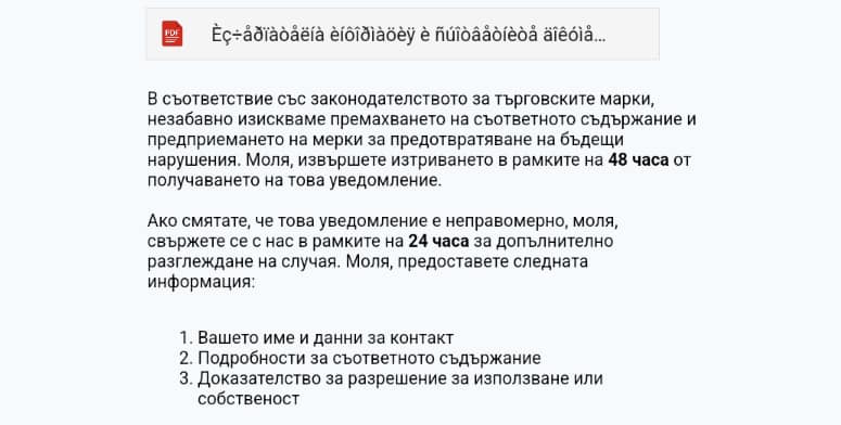 Дирекция „Киберпрестъпност“ към ГДБОП-МВР предупреждава за активна фишинг кампания от името на адвокатски дружества към потребителите за нарушаване на авторските права. Най-често получените съобщения на електронните пощи на потребителите гласят: „Уведомление за нарушение на авторските права върху търговска марка“ или „Предупреждение за неразрешено използване на търговска марка“.