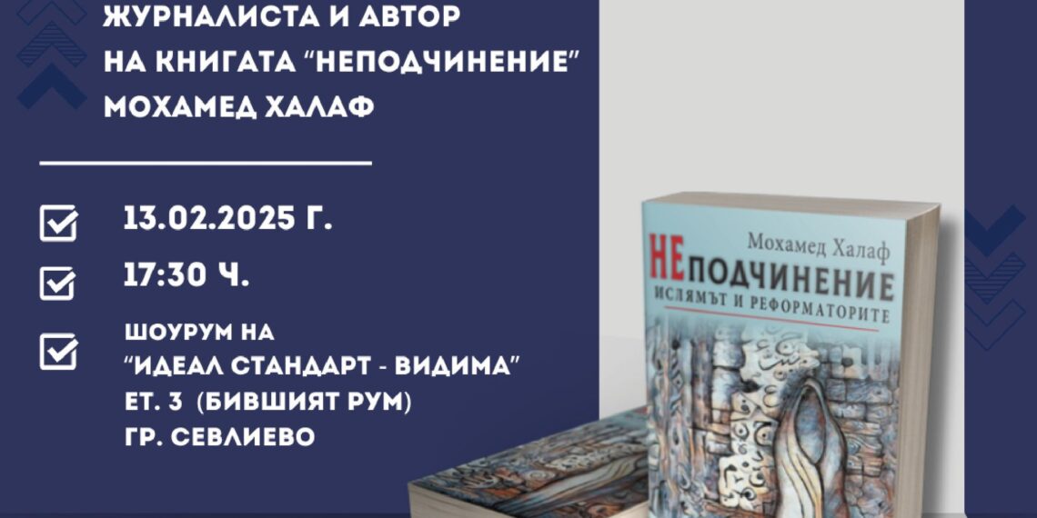 Известният журналист и преподавател д-р Мохамед Халаф ще представи новата си книга „НЕподчинение. Ислямът и реформаторите“ в Шоурума на „Идеал Стандарт – Видима“ утре – 13 февруари, от 17:30 ч. Д-р Халаф е сред утвърдените анализатори на процесите в Близкия изток и арабските страни. Избягал от режима на Садам Хюсеин през 1978 г., идва в България и избира да остане тук. Днес съчетава журналистическата си работа с преподавателска дейност в Софийски университет „Св. Климент Охридски“.