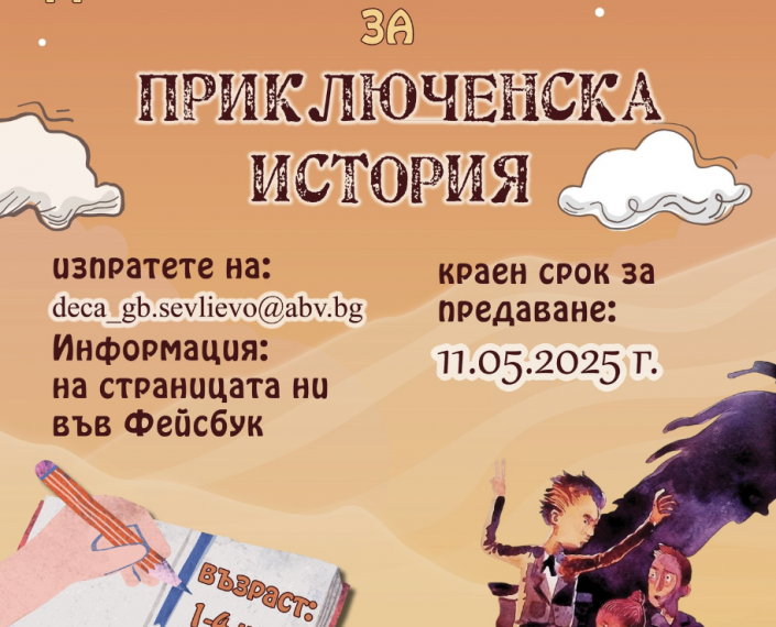 Крайният срок за предаване на творбите е 11 май 2025 г., на е-mai: deca_gb.sevlievo@abv.bg <mailto:deca_gb.sevlievo@abv.bg>. Отличените творби ще бъдат обявени на 23 май 2025 г. Наградените участници от всяка възрастова група ще получат грамота и предметна награда – ваучер за закупуване на книги: първа награда – 100 лв., втора награда – 70 лв., трета награда – 50 лв. и поощрителна награда – 30 лв.