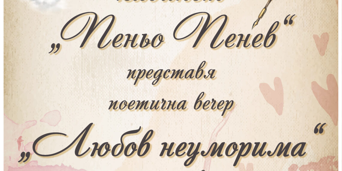 Творците от Литературен кабинет „Пеньо Пенев” при Народно читалище „Развитие-1870” канят на поетична вечер в месеца на любовта и виното. Събитието ще се проведе на 20 февруари 2025 г., от 17:30 ч., в галерия „Видима”.