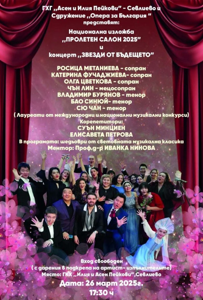 Само след седмица, на 26 март ( сряда) от 17:30 ч., ГХГ ,,Асен и Илия Пейкови“ предоставя като домакин прекрасното си арт пространство за две изкуства – изобразителното и музикалното, преплитащи се в своеобразна синкретика. Тогава севлиевци ще имат удоволствието да се насладят освен на художествените творби от националната изложба „Пролетен салон 2025“ и на един бутиков концерт, озаглавен „Звезди от бъдещето“.
