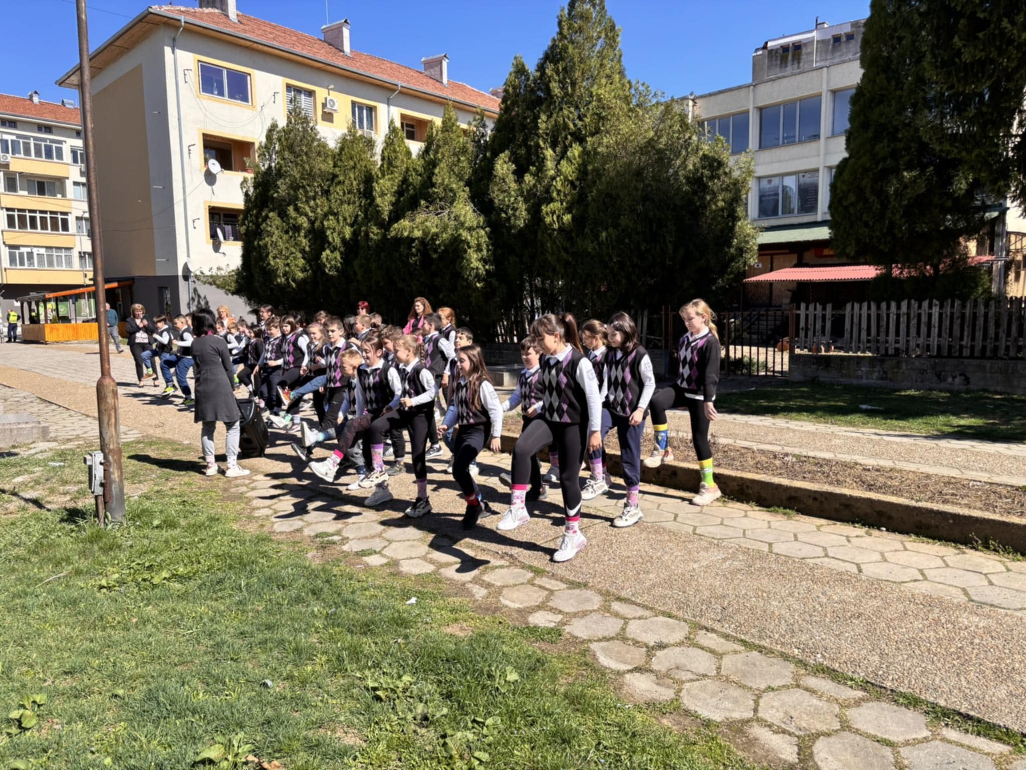 Децата подкрепиха за пореден път „най-слънчевите хора на планетата“, каквато е тяхната съученичка Дария. На алеята пред училището и на пешеходната пътека на ул. „Стефан Пешев“, обути с шарени чорапи, те изпълниха специален танц. А Дария рецитира любимо стихче.