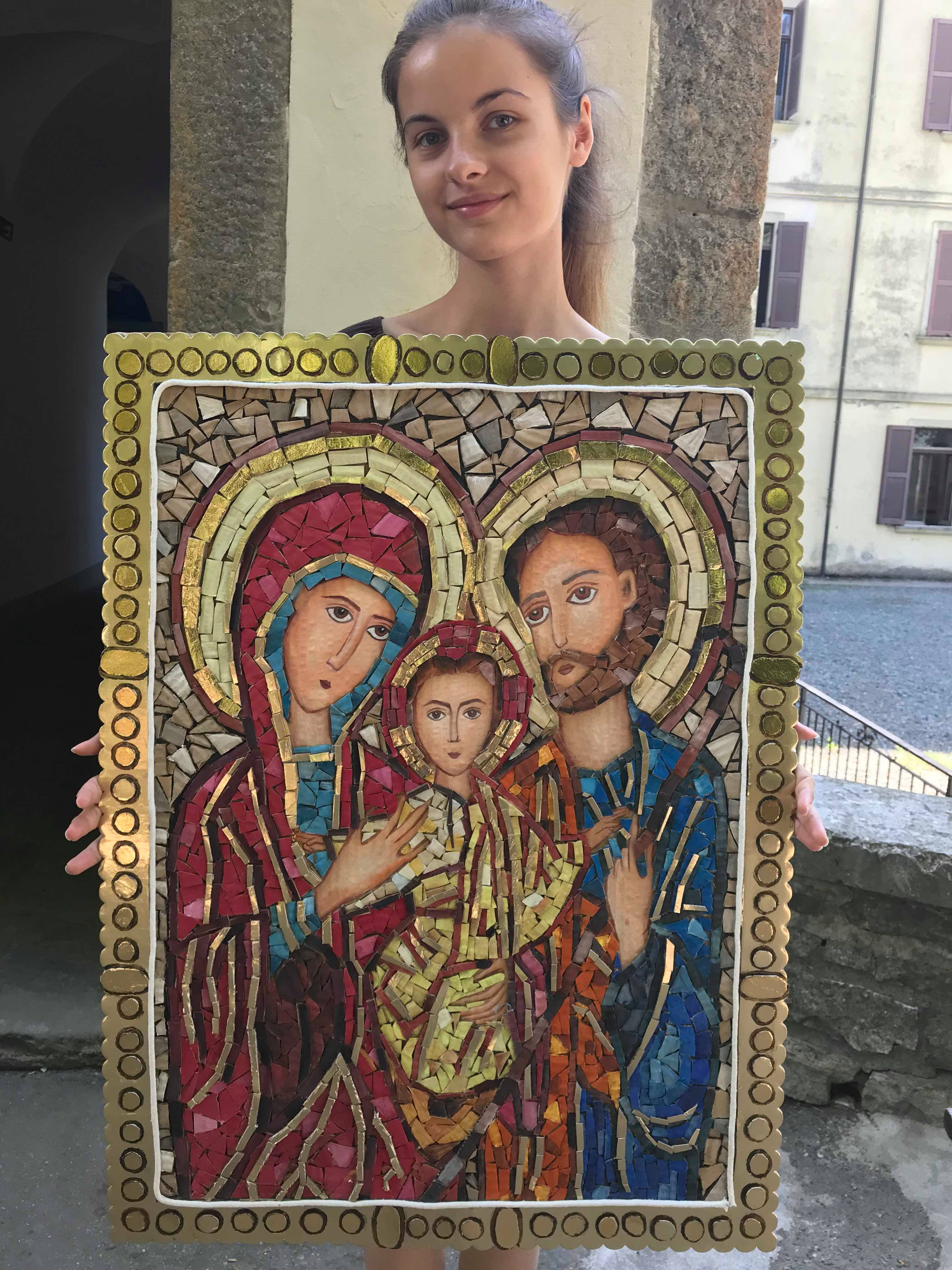 Виждайки празните коридори в сградата и група студенти от Словения да редят мозайки на религиозна тема по стените, ръководителката на нашата школа решава да направят копие на чудотворната иконата, която се съхранява в църквата, до която водят коридорите на семинарията. Освен копието на чудотворната икона, децата започват да творят и изпълват пространството със своите уникални икони, с красиви рамки и … нарисувани според канона. „Главният коридор и фоайетата са украсени с нашите икони. Там те стоят точно на мястото си и украсяват перфектно цялото пространство“, казва още Снежана Велчева. По думите й в момента един от етажите на сградата е предназначен за поклонници, които вървят по пътя на кръстоносците. „Тази година дори в един от дните на нашата смяна те бяха на гости в семинарията, а децата им изнесоха специален концерт. Сред гостите по време на тазгодишния им престой били главният свещеник на Северна Италия и собственикът на известната марка паста Barilla. Двамата били много впечатлени от факта, че децата от Севлиево рисуват чудните си икони върху кашоните от тази марка макарони. По този повод в местния вестник Gazzetta di Parma излиза специална статия, отразяваща случващото се в лагера.