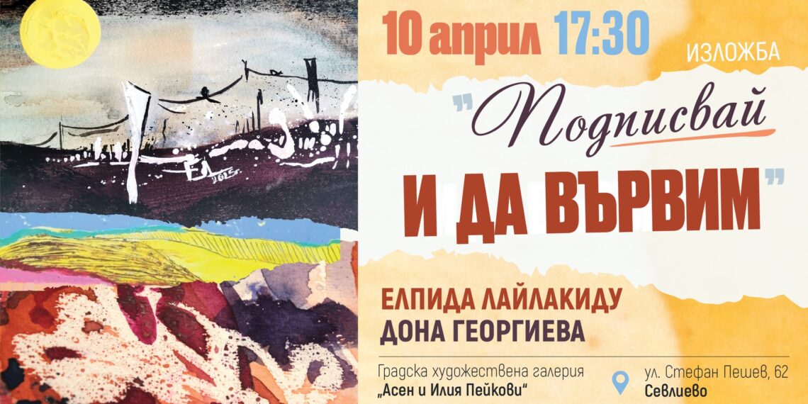 Исторически музей Севлиево и Градска художествена галерия „Асен и Илия Пейкови“ представят „Подписвай и да вървим“ – съвместна изложба на авторите Дона Георгиева и Елпида Лайлакиду, в която визуалното и символичното се преплитат в една динамична художествена среща.