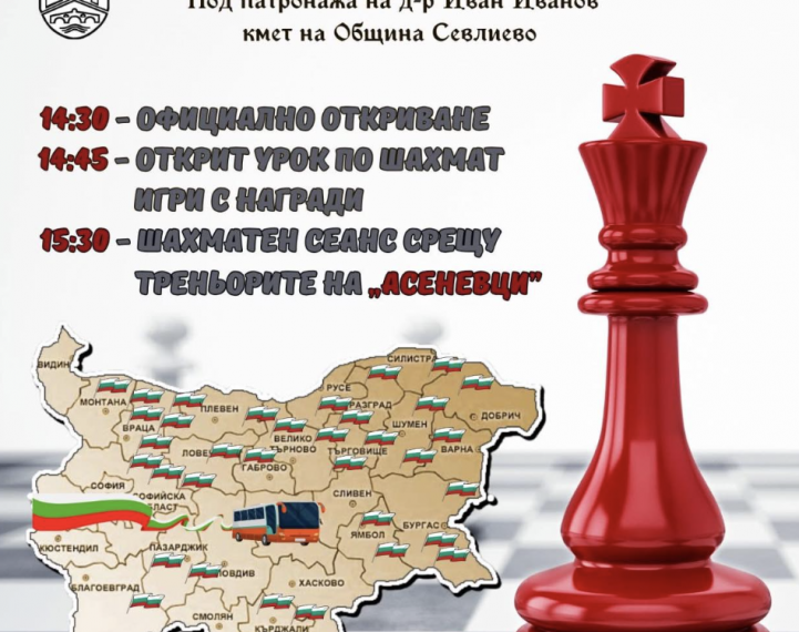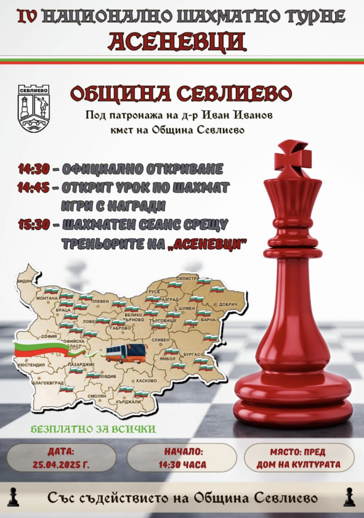 Националното шахматно турне „Асеневци“ и тази година ще премине през Севлиево, за да вдъхнови малките бъдещи гросмайстори от нашия град. Всеки, който иска да разбере как пешката става царица, може да го направи на 25 април, от 14:30 часа, пред дома на културата „Мара Белчева“. Веднага след официалното откриване започва открит урок по шахмат с игри и награди, а от 15:30 ч. ще има сеанс срещу треньорите на „Асеневци“.