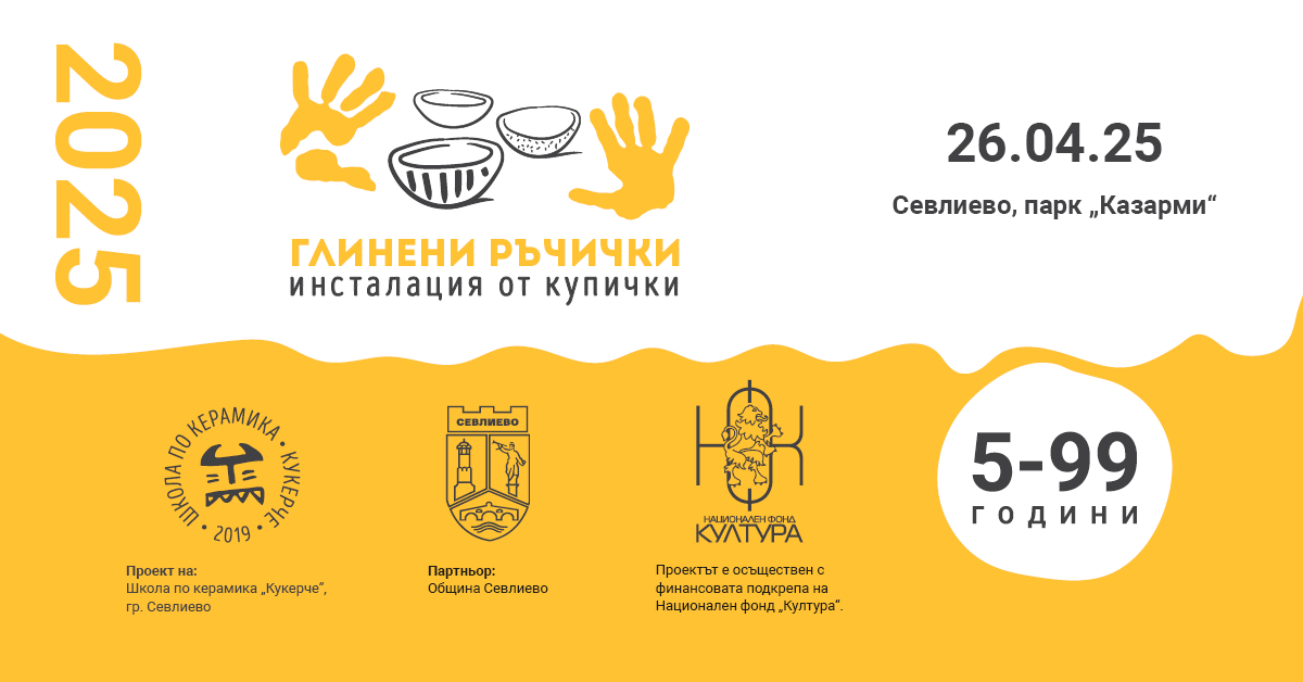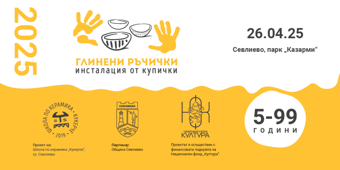 Проектът „Глинени ръчички – инсталация от купички“ има за цел да популяризира приложното изкуство и да въвлече любителите на керамиката в създаването на обща арт инсталация. Всеки желаещ, независимо от възрастта си, може да се включи като сътвори своя уникална декоративна мини купичка от глина – бяла, черна или червена – използвайки техниката „пощипване“. Тази древна и в същото време съвременна керамична техника предоставя възможност на участниците не само да създадат нещо красиво, но и да се докоснат до дълбоката традиция на ръчното изкуство.