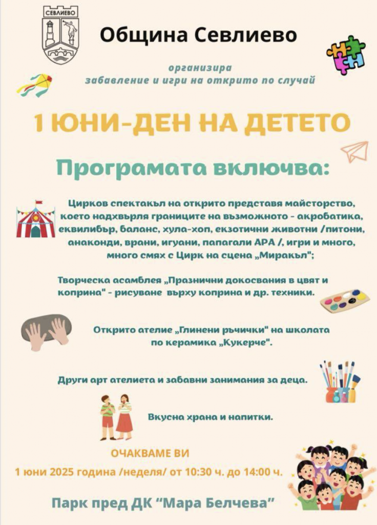 В Деня на детето – 1 юни, от 10:30 до 14:00 часа. паркът пред дома на културата “Мара Белчева” ще се превърне в пъстра палитра от празнични събития за малките, големите и порасналите деца на Севлиево. Всички те ще се забавляват със спектакъл на открито, като цирк на сцена „Миракъл“ ще представи майсторство, което надхвърля границите на възможното. Акробатика, еквилибър, баланс, хула-хоп, екзотични животни – питони, анаконди, врани, игуани, папагали АРА, игри и много, много смях.