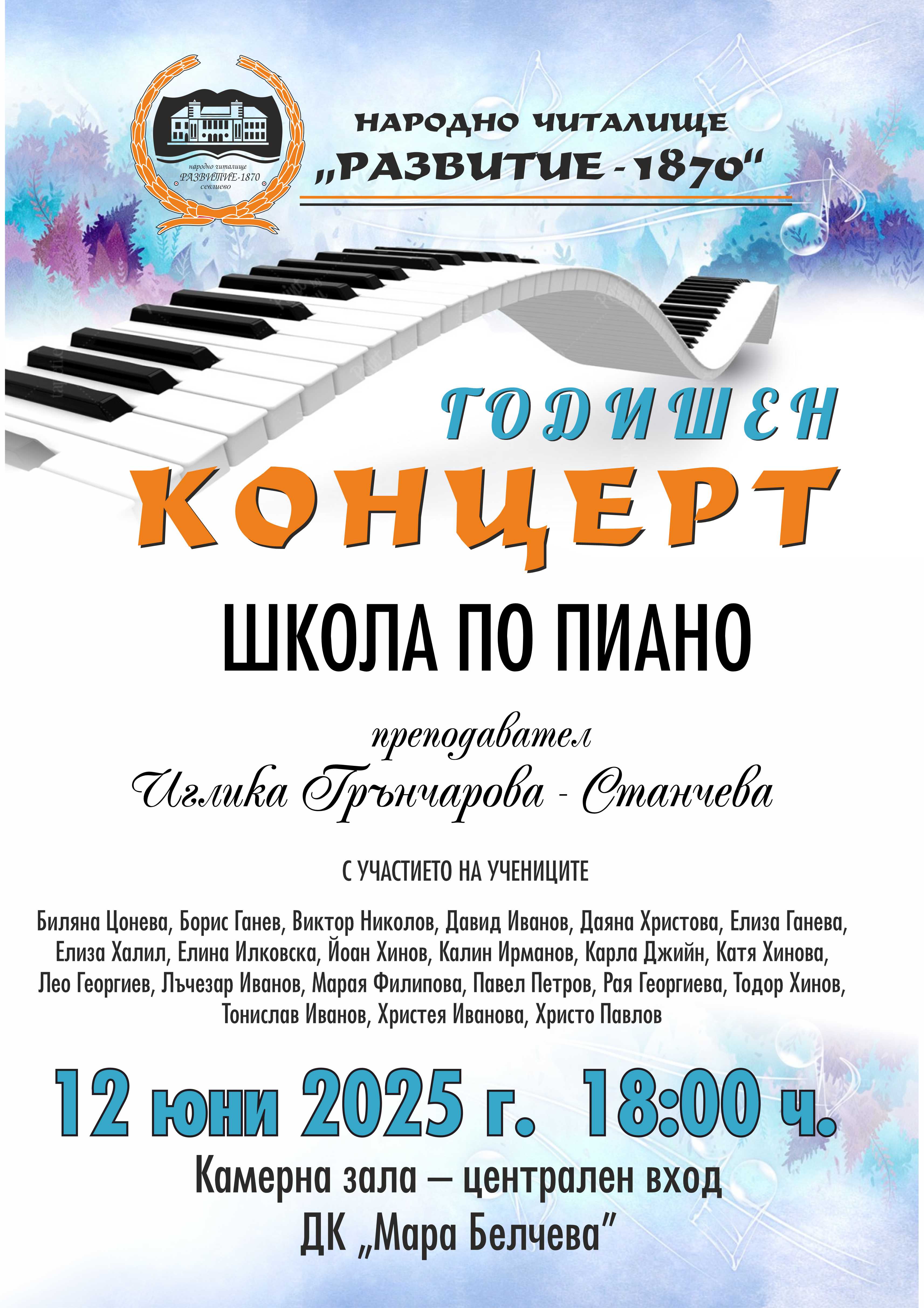 Учениците от Школа по пиано при Народно читалище „Развитие-1870” ще изнесат своя годишен концерт на 12 юни 2025 г. Начален час – 18:00, мястото – Камерната зала на Дом на културата „Мара Белчева”. В програмата ще участват: Биляна Цонева, Борис Ганев, Виктор Николов, Давид Иванов, Даяна Христова, Елиза Ганева, Елиза Халил, Елина Илковска, Йоан Хинов, Калин Ирманов, Карла Джийн, Катя Хинова, Лео Георгиев, Лъчезар Иванов, Марая Филипова, Павел Петров, Рая Георгиева, Тодор Хинов, Тонислав Иванов, Христея Иванова, Христо Павлов.
