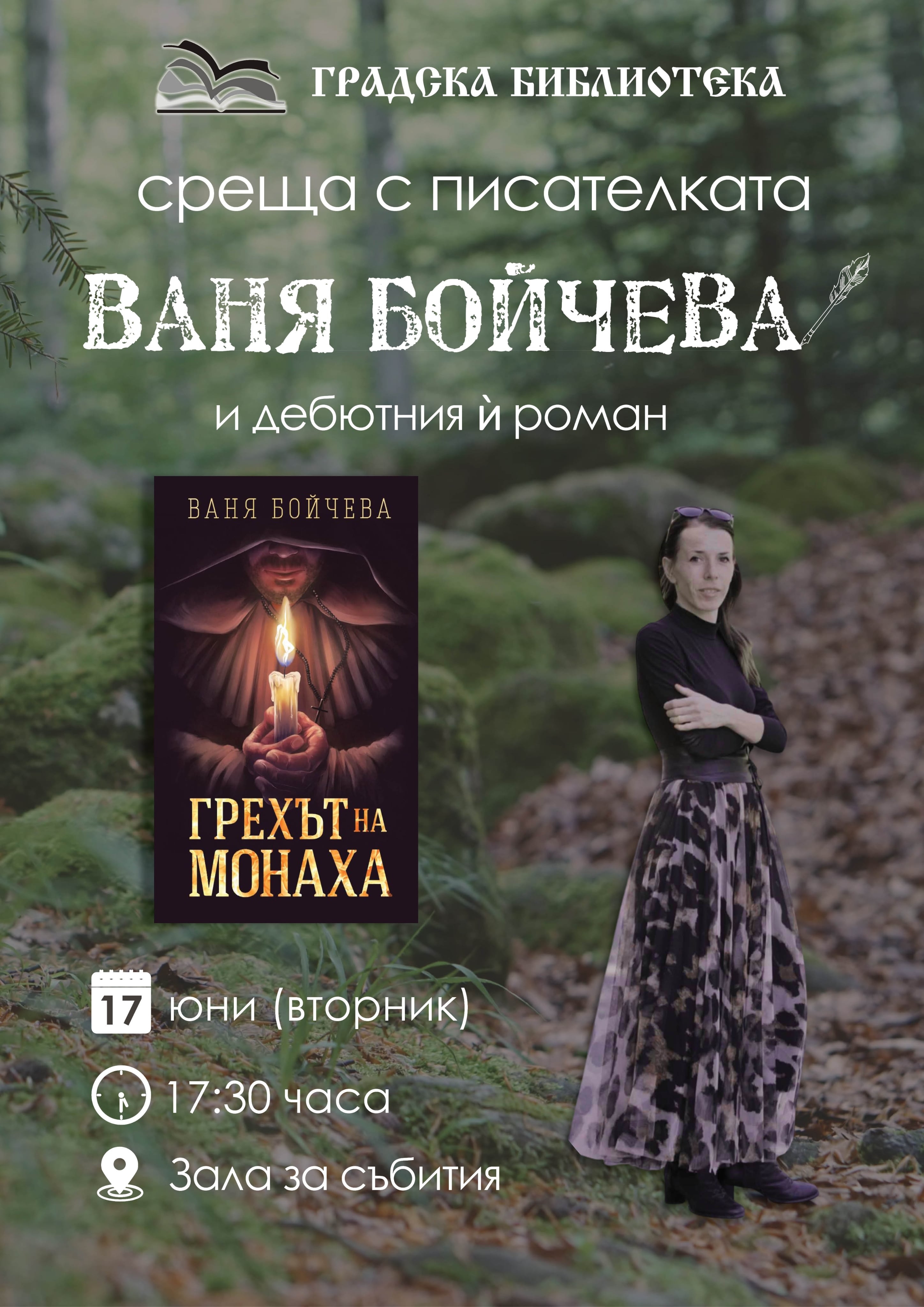 На литературна вечер, изпълнена с история, страст и вътрешни борби кани Градска библиотека – Севлиево. На 17 юни (вторник) от 17:30 ч., в Залата за събития, почитателите на българската литература ще имат възможност да се срещнат с писателката Ваня Бойчева, която ще представи своя дебютен роман „Грехът на монаха“.
