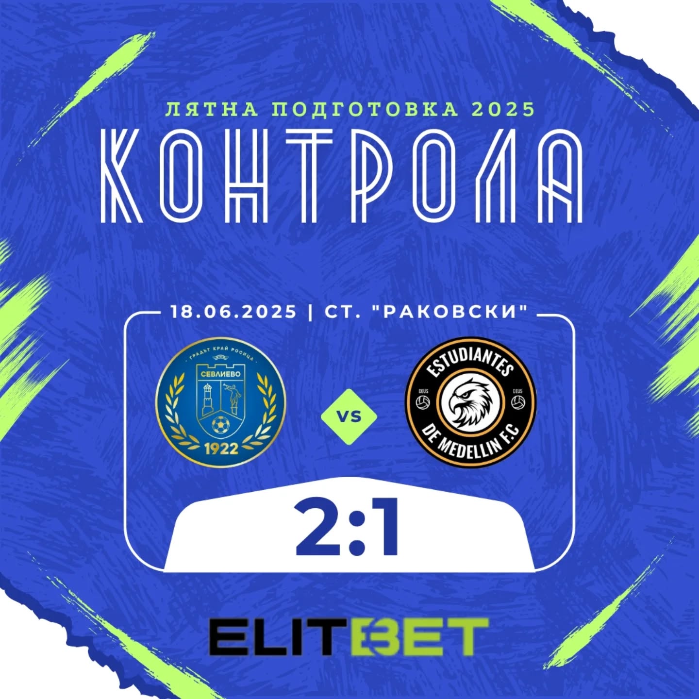 ФК „Севлиево“ победи с 2:1 колумбийския „Естудиантес“ (Меделин) в първата си лятна контрола, играна на стадион „Раковски“. Кристиян Кънчев откри в 30 минута, като довкара избита топка от вратаря на гостите. Четвърт час преди края Никола Владев удвои след асистенция на доскорошното крило на „Янтра“ (Габрово) Емил Колев. В 85 минута колумбийският тим намали при центриране от корнер.