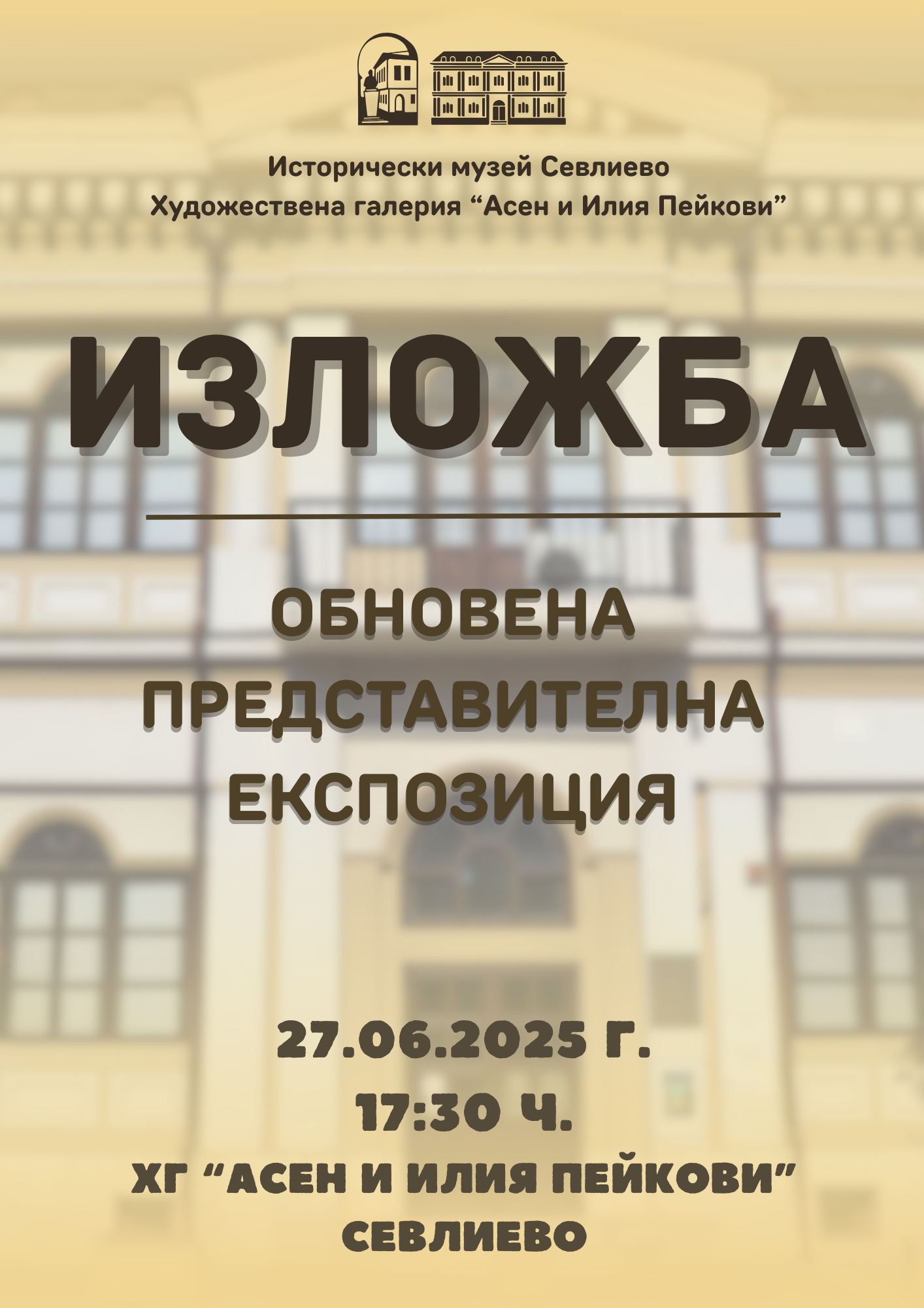 Тази вечер от 17:30 ч. в Художествена галерия „Асен и Илия Пейкови“ в Севлиево ще бъде открита обновената представителна експозиция по повод 17 години от експонирането на художествения фонд в настоящата сграда на галерията.