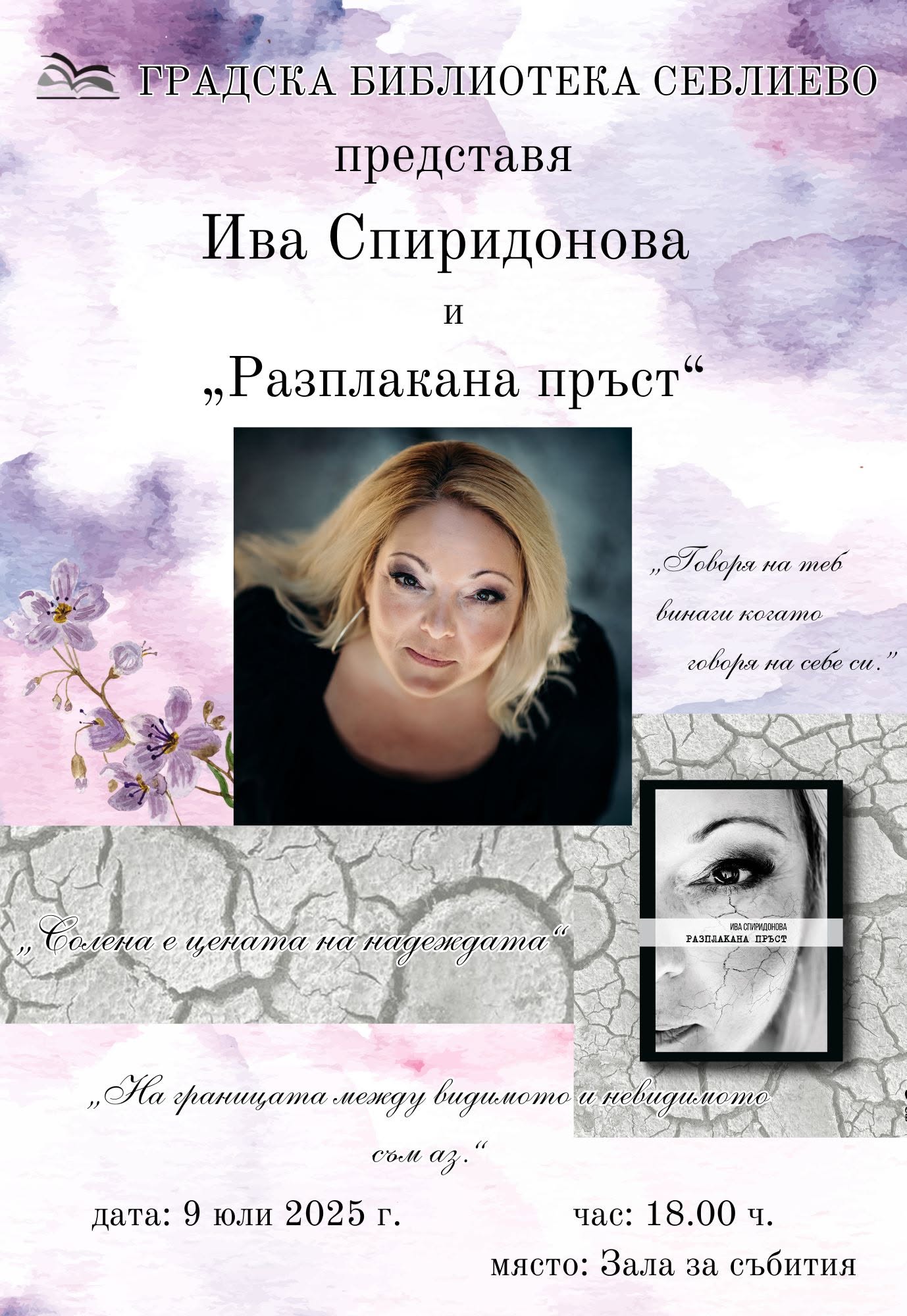 Градската библиотека в Севлиево отправя покана към всички почитатели на съвременната българска поезия за среща с поетесата Ива Спиридонова и най-новата и стихосбирка „Разплакана пръст“. Литературната вечер ще се проведе на 9 юли (сряда) от 18:00 часа, в партньорство с издателство „Библиотека България“. Входът е свободен.