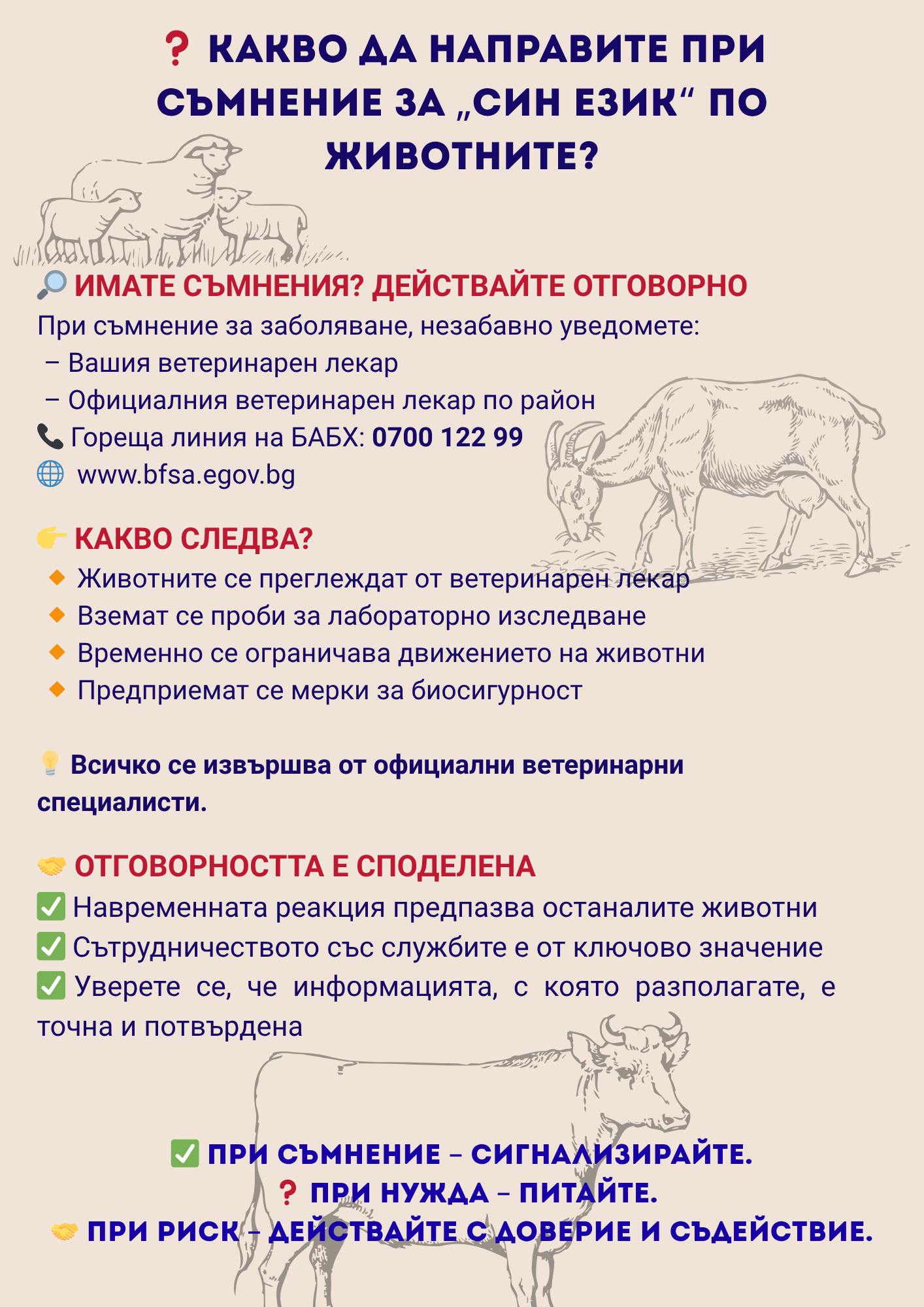 За повече информация относно болестта син език, включително за симптомите, начините на разпространение и приложимите контролни мерки, посетете официалната страница на БАБХ.