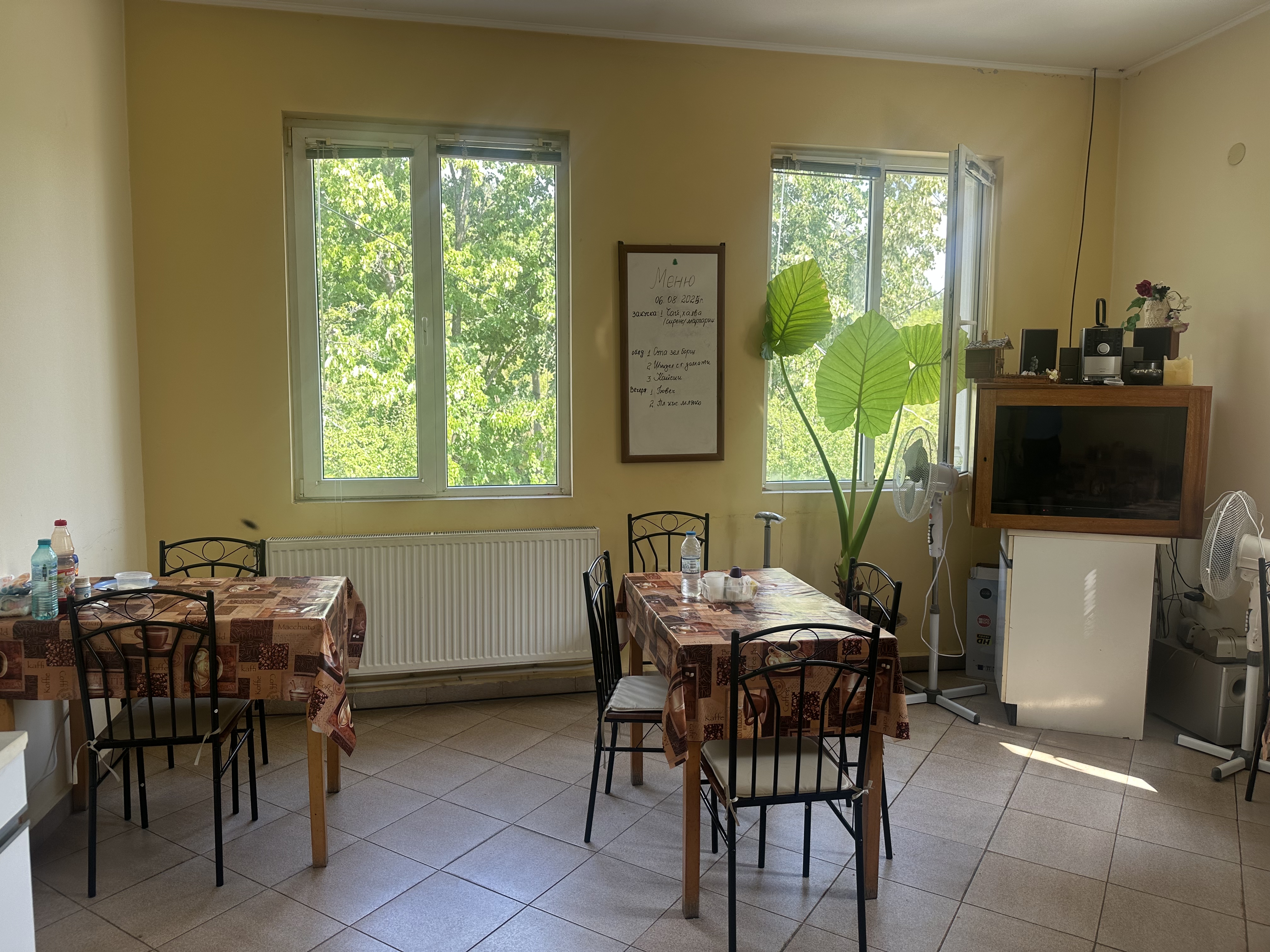Сградата прави впечатление отдалеко – цветна, личи че скоро е санирана, а дворът е подреден, с малко езерце с лилии, което подсказва, че се стопанисва добре. След позвъняване ни посрещна млада, усмихната жена, а вътре – атмосферата е като в истински дом. На всяка площадка на стълбите има цветя, мъже и жени се разхождат спокойно по коридорите и това, което най-напомня, че си в истински дом, е уханието на вкусна храна – посещението ни беше преди обед, когато обикновено домакините готвят.