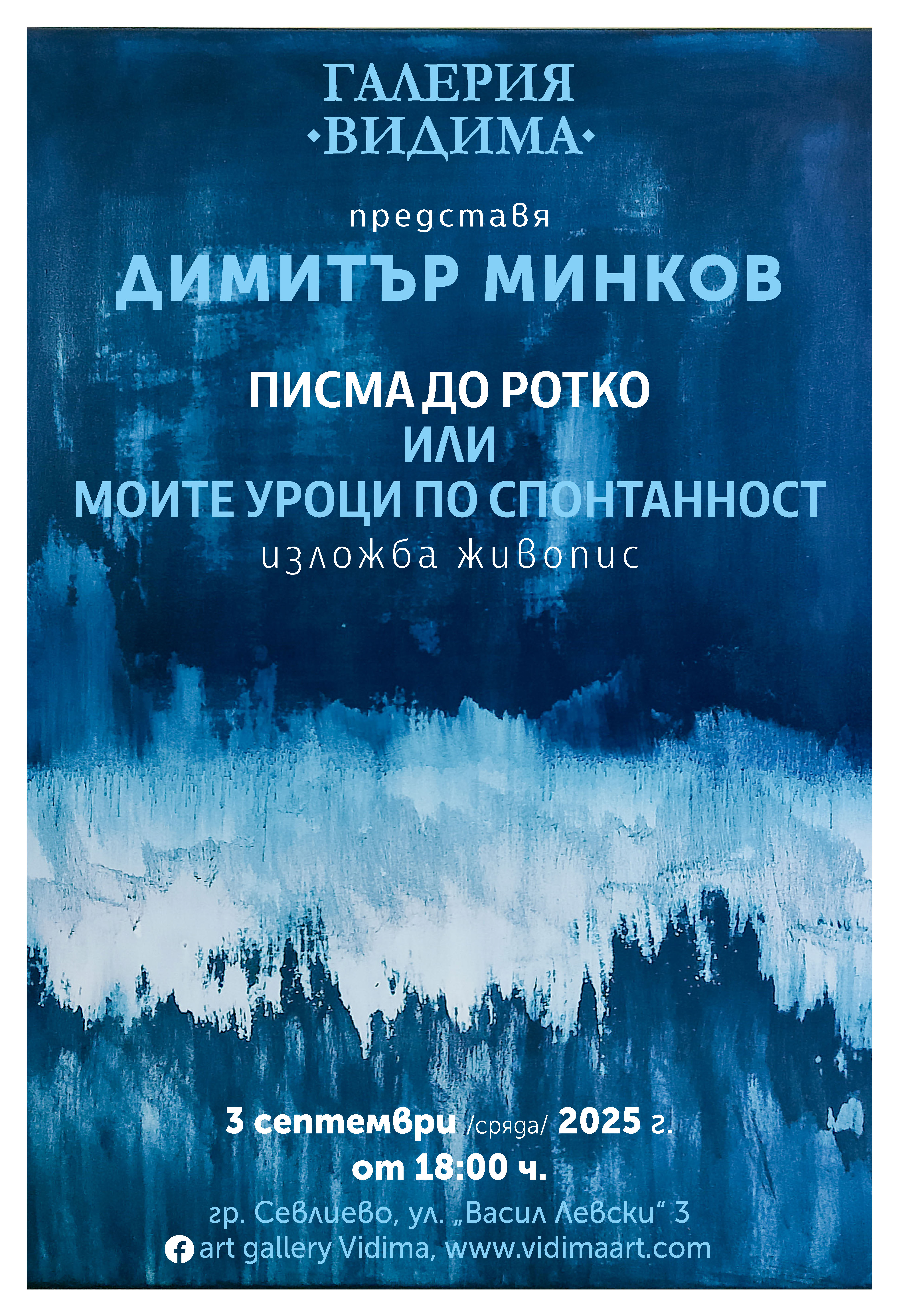 На 3 септември галерия „Видима“ ще представи „Писма до Ротко или моите уроци по спонтанност“, изложба-живопис на Димитър Минков. Авторът е български многопластов творец, който експериментира с разнообразен пластически израз в своите творчески търсения и реализира идеите си в най-различни визуални направления.