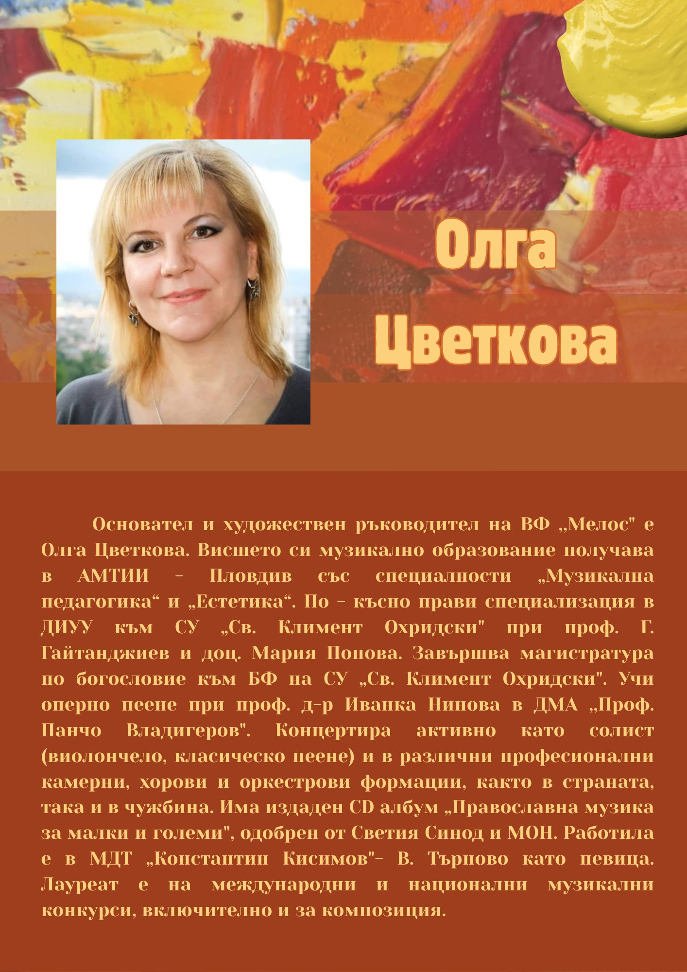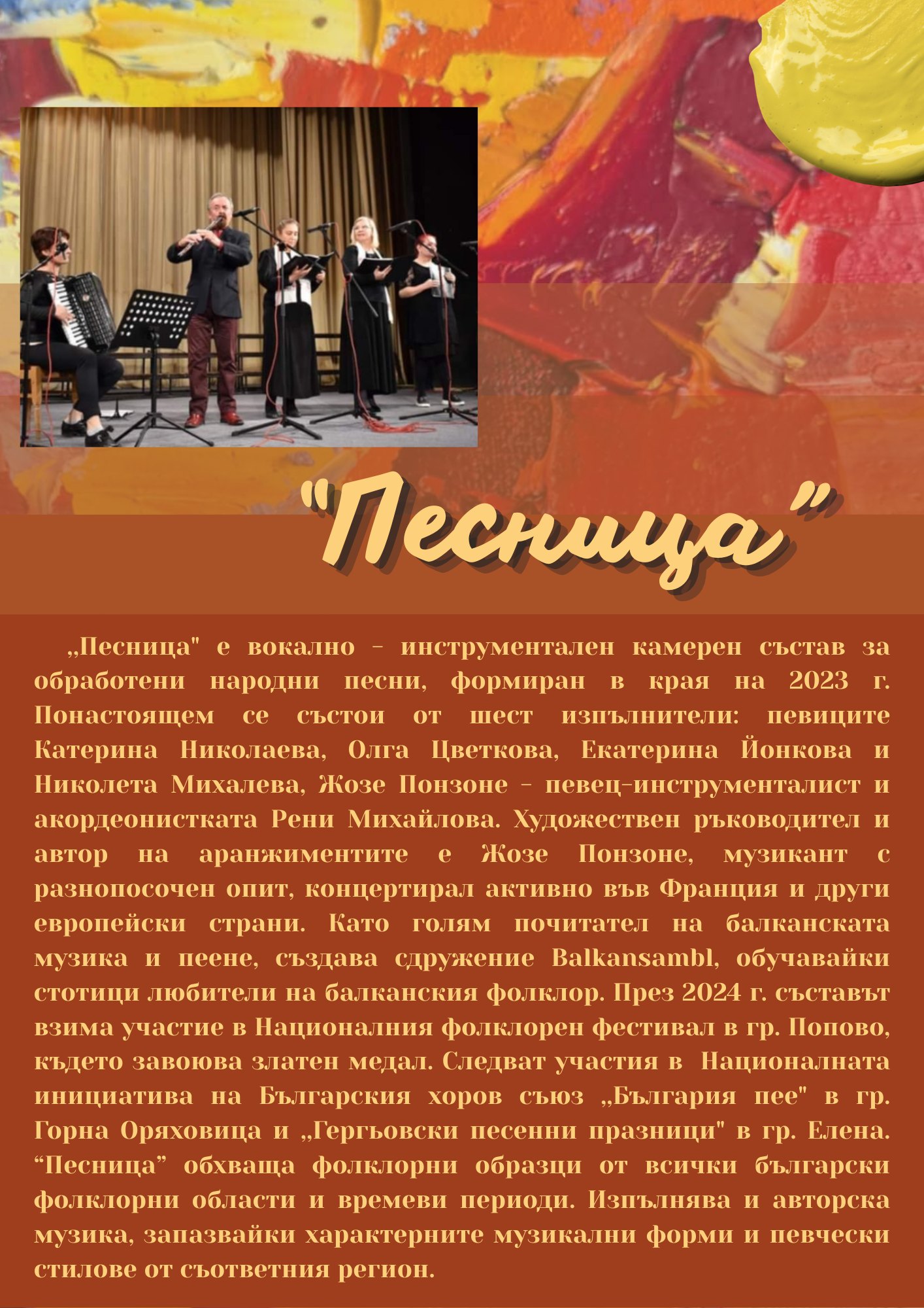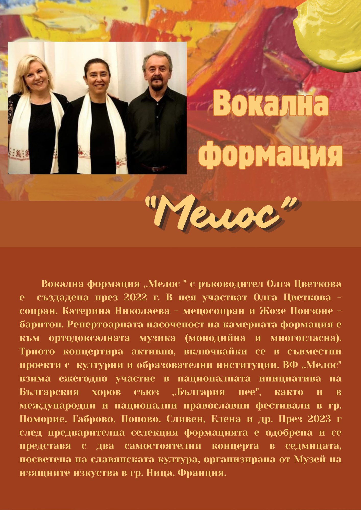 Празничната вечер ще бъде обогатена и от музикална програма. Своите изпълнения ще представят Вокална формация „Мелос“ – Севлиево с ръководител Олга Цветкова