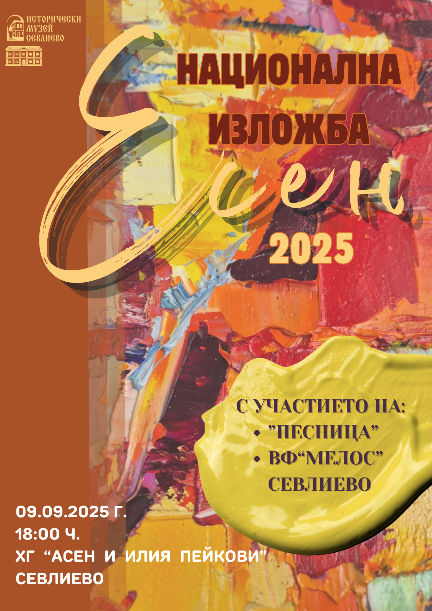На 17-та поредна година Севлиево ще бъде домакин на едно от най-значимите събития в културния календар на Художествена галерия „Асен и Илия Пейкови“ – Национална изложба „Есен 2025“. Експозицията е част от трите традиционни годишни събития на галерията и дава сцена за изява на автори от цялата страна.