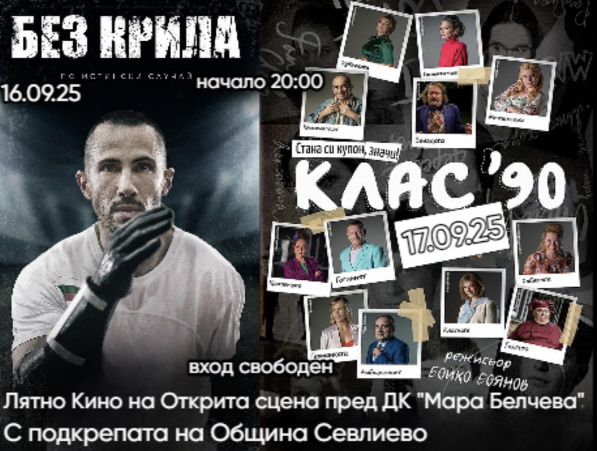 С два уникални филма закриваме филмовото лято на 16 и 17 септември от 20:00 пред Дом на културата “Мара Белчева”. Първият ден гледаме “Без крила” на Ники Илиев, с участието на: Наум Шопов-младши, Леарт Докле, Стефани Обадяру, Башар Рахал и др. В главната роля е Иван Иванов.