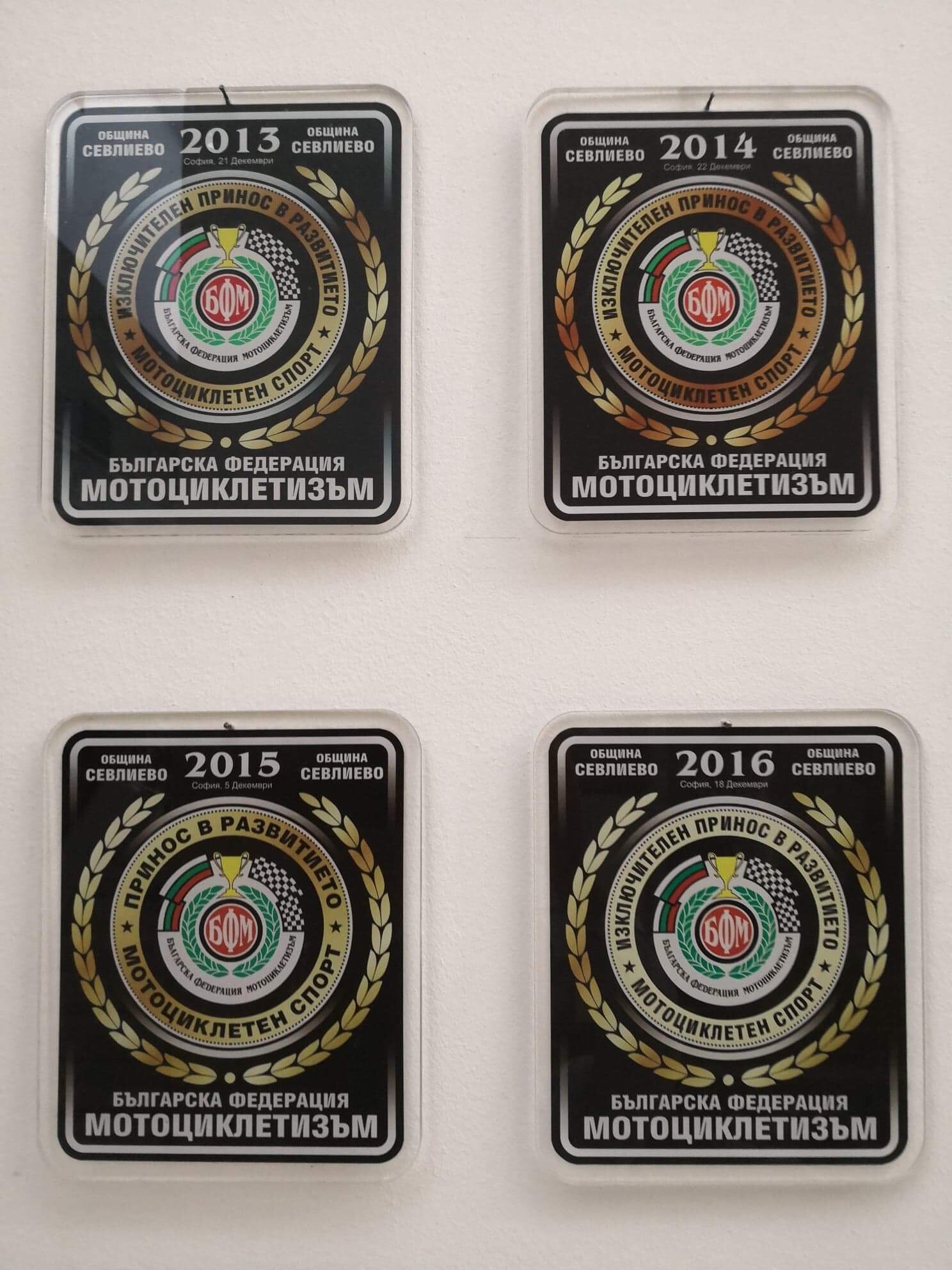 В знак на благодарност за грижите, които полагаме за мотокроса у нас, всяка година Българската федерация по мотоциклетизъм удостоява Община Севлиево с награда за изключителен принос в развитието на мотоциклетния спорт.