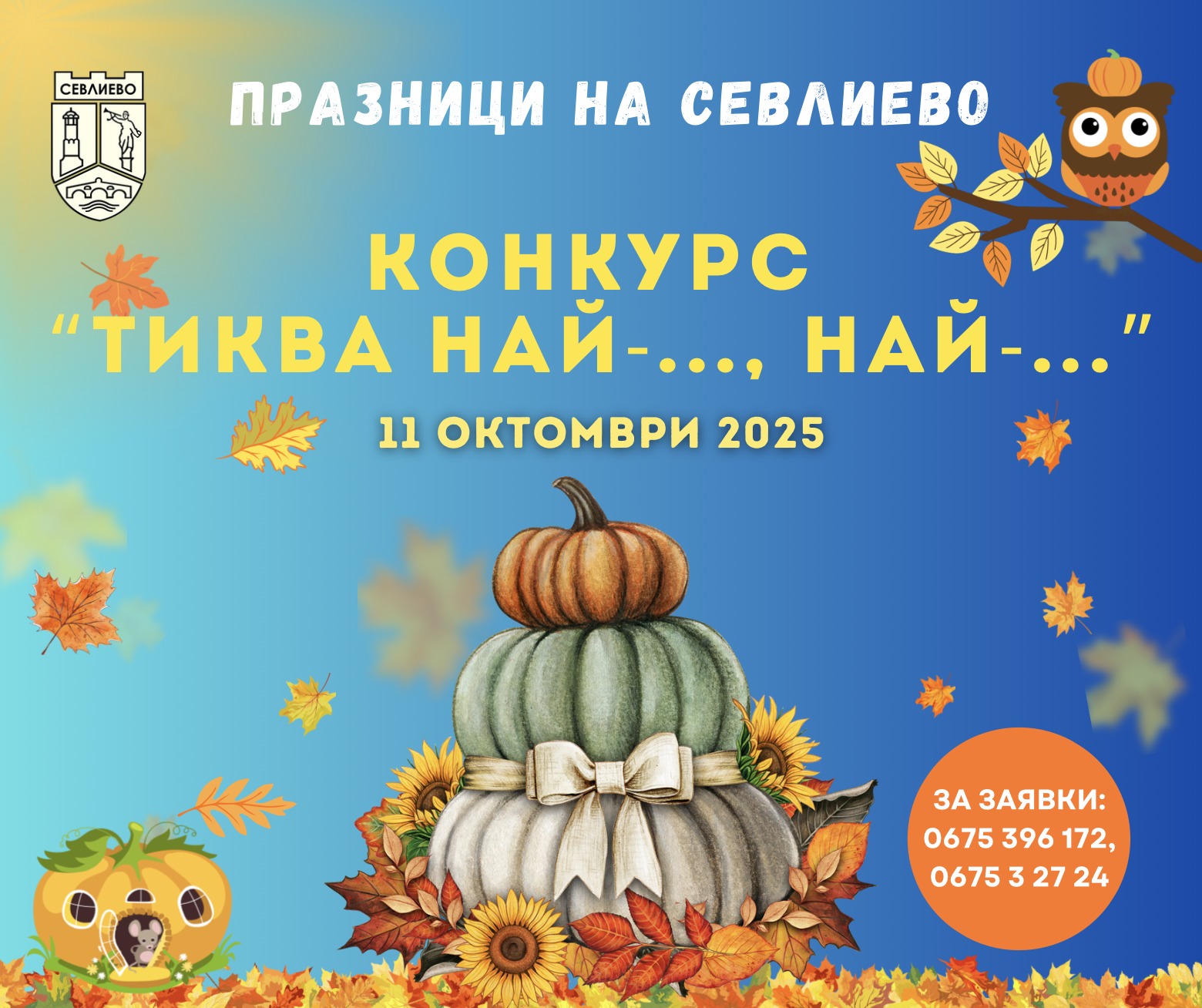 Конкурсът „Тиква най-…, най-“ тази година ще се проведе на 11 октомври на площад „Свобода“, в рамките на Празниците на Севлиево, които започват на 7 октомври и ще продължат до 14 октомври, Петковден – Ден на град Севлиево.