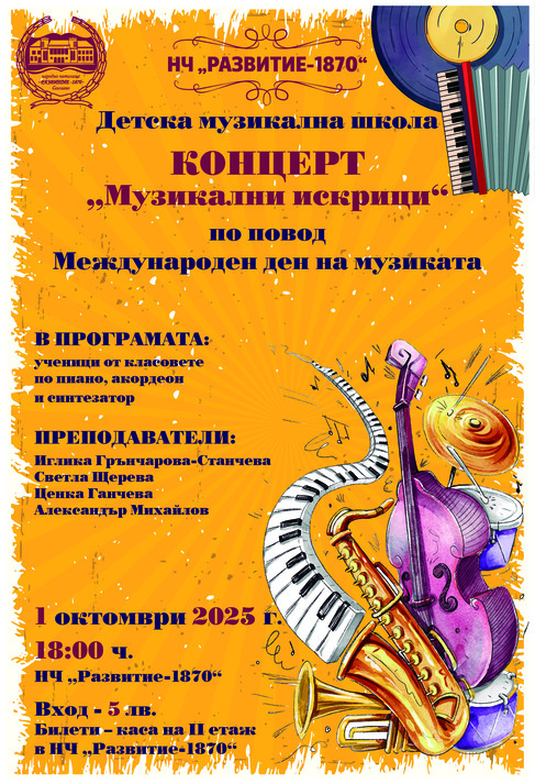 На концерт „Музикални искрици” канят талантите от Детска музикална школа при Народно читалище „Развитие-1870”. На 1 октомври 2025 г., от 18:00 ч., в читалищния салон севлиевци ще могат да се насладят на изпълнения на пиано, акордеон и синтезатор. В програмата на концерта, организиран по повод Международния ден на музиката, ще участват възпитаници на преподавателите Иглика Грънчарова-Станчева, Светла Щерева, Ценка Ганчева и Александър Михайлов.